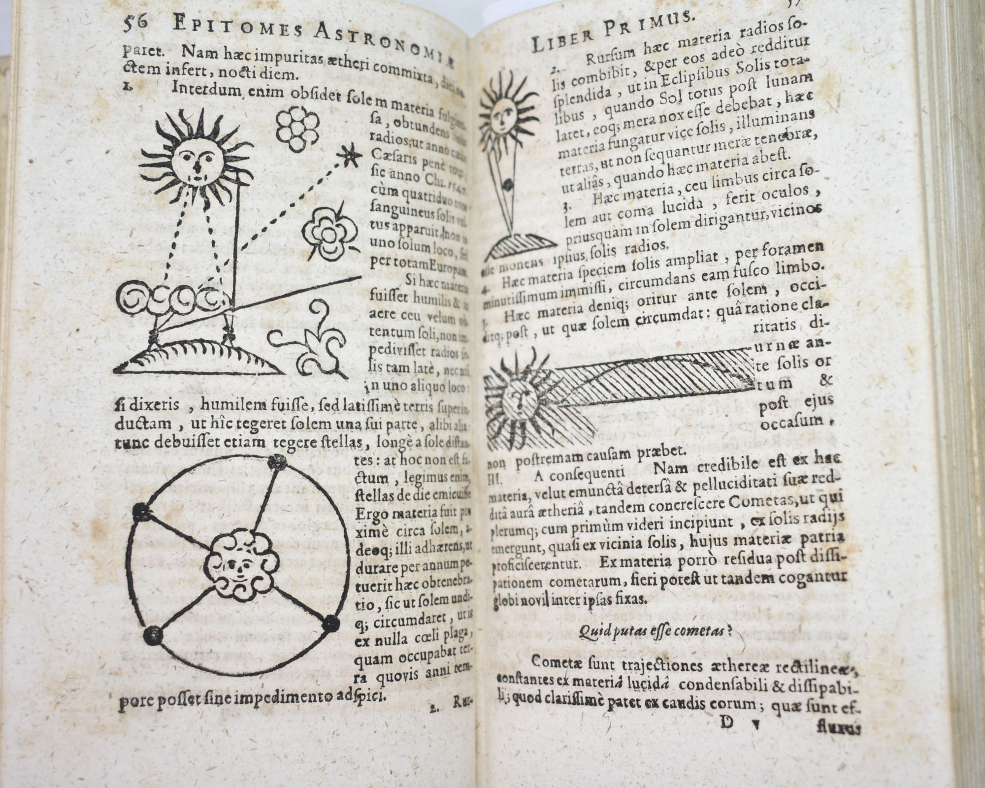 1 vol., in 8°, cm 16x10,5, p. [28], 417, (5). Rilegatura coeva in piena pergamena.Figurato scientifico Seicentesco con la Prima edizione (Linz, 1618) del primo volume (Libri I-III) della raccolta di studi sul sistema eliocentrico di Giovanni Keplero (1571-1630, astronomo e matematico tedesco). In essa K. illustrava il sistema copernicano sullo sfondo di una riorganizzazione della scienza astronomica, ora divisa in cinque ambiti: storico, ottico, fisico, aritmetico e meccanico. In ognuno di questi ricadevano rispettivamente le osservazioni, le ipotesi, le basi per le ipotesi, le tavole, i calcoli e gli strumenti. Diviso in sette libri, pubblicati tra il 1618 e il 1621, l'Epitome copre gran parte del pensiero precedente di Keplero, così come le sue posizioni successive su fisica, metafisica e archetipi. A causa del sostegno del libro all'eliocentrismo, il primo volume fu inserito nell'Indice dei libri proibiti il 28 febbraio 1619. Buon esemplare con lievi fioriture e bruniture, una lieve gora marginale; piccoli difetti come la rifilatura di 2 carte (**2 e **3) fino a toccare il testo; restauro all'angolo inferiore delle prime 8 carte. Cfr. Carli-Favaro 76, 92; Caspar 55, 66, 69; Cinti 60, 72, 67; Houzeau-Lancaster 11831; PMM 112; Sotheran I, 114; Treccani.