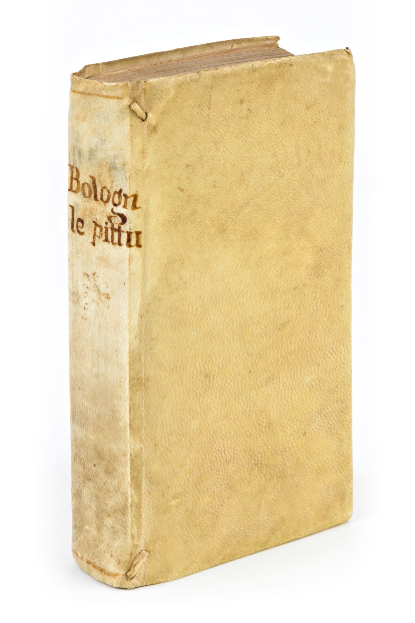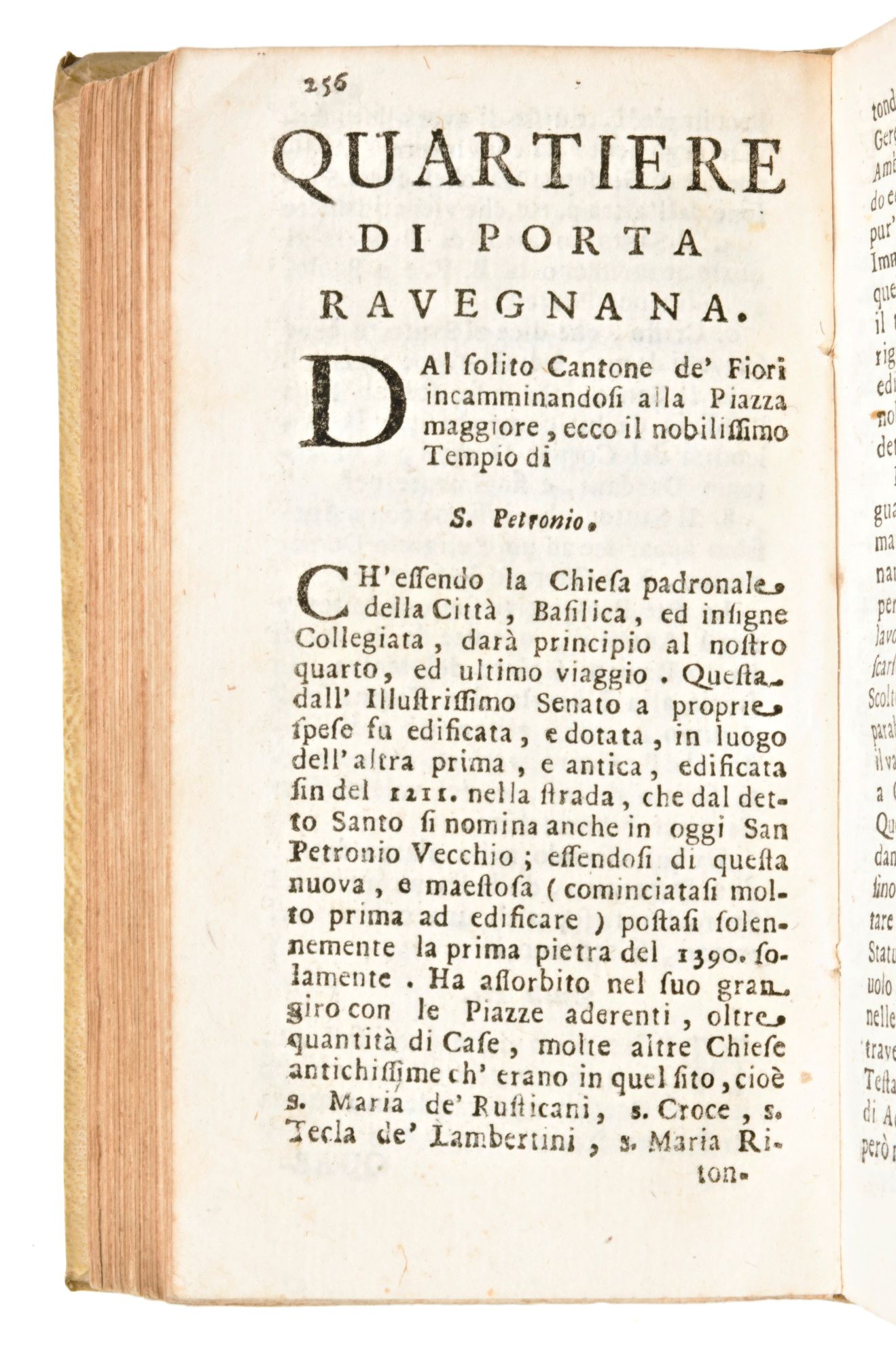 In-8°, mm. 145x85, pp. (36), 384. Rilegatura coeva in piena pergamena con titoli manoscritti al dorso. Solco di tarlo alle prime 8 carte e alle ultime 12 con piccole perdite di testo (Front. e intro). Fregio al frontespizio e capolettera istoriati. Lievi fioriture e minimi segni del tempo alle carte. Non comune edizione di questo classico della storiografia artistica bolognese la cui stampa originale risale al 1686.