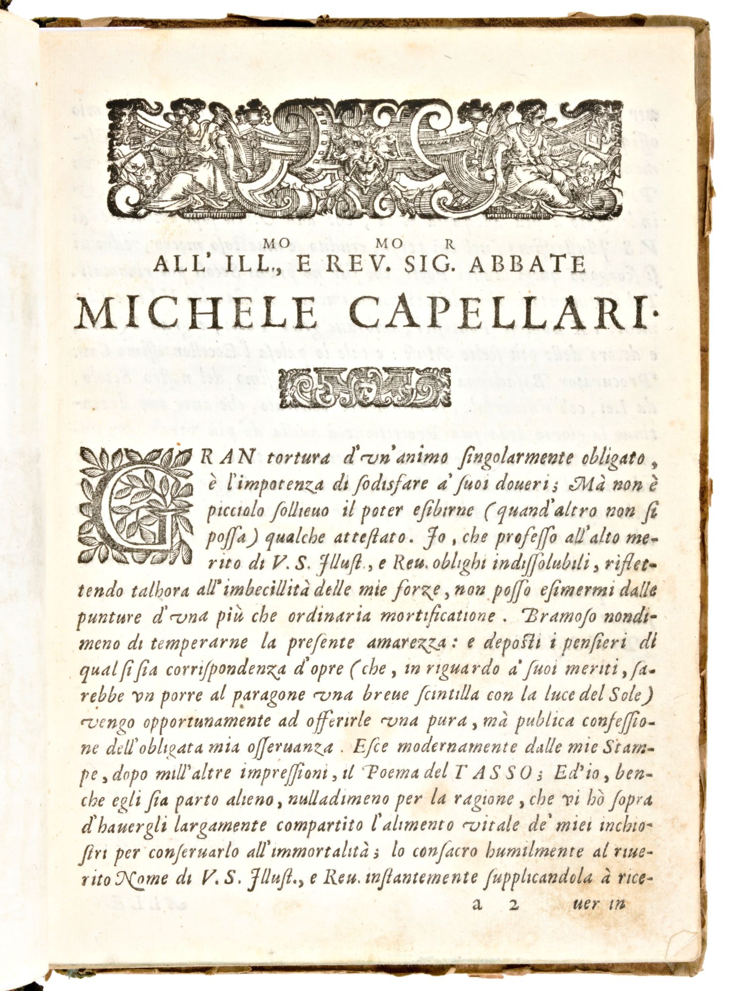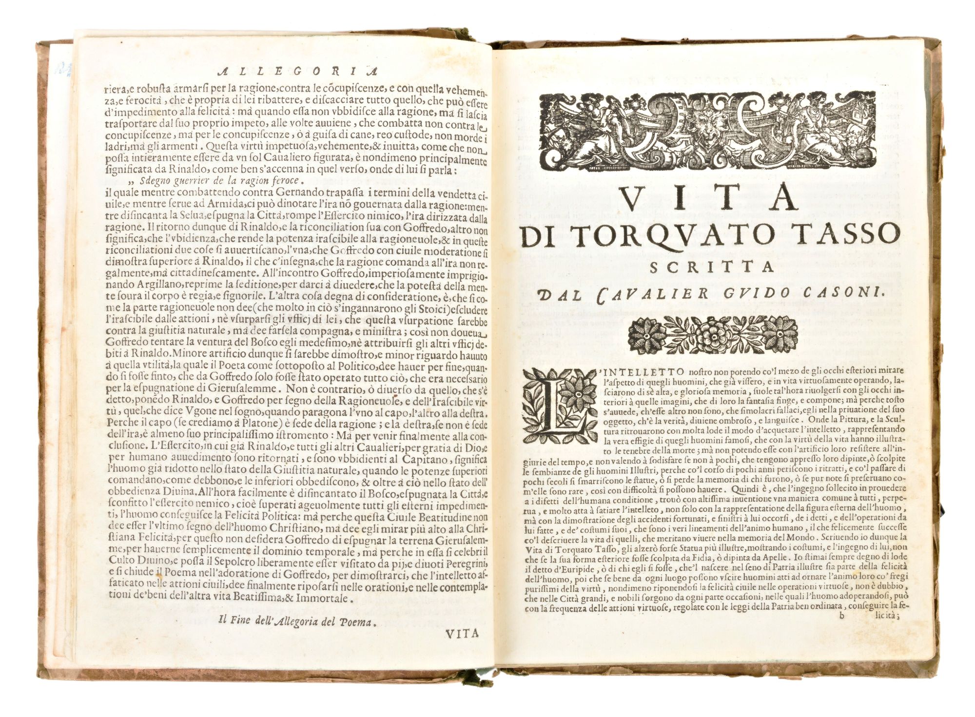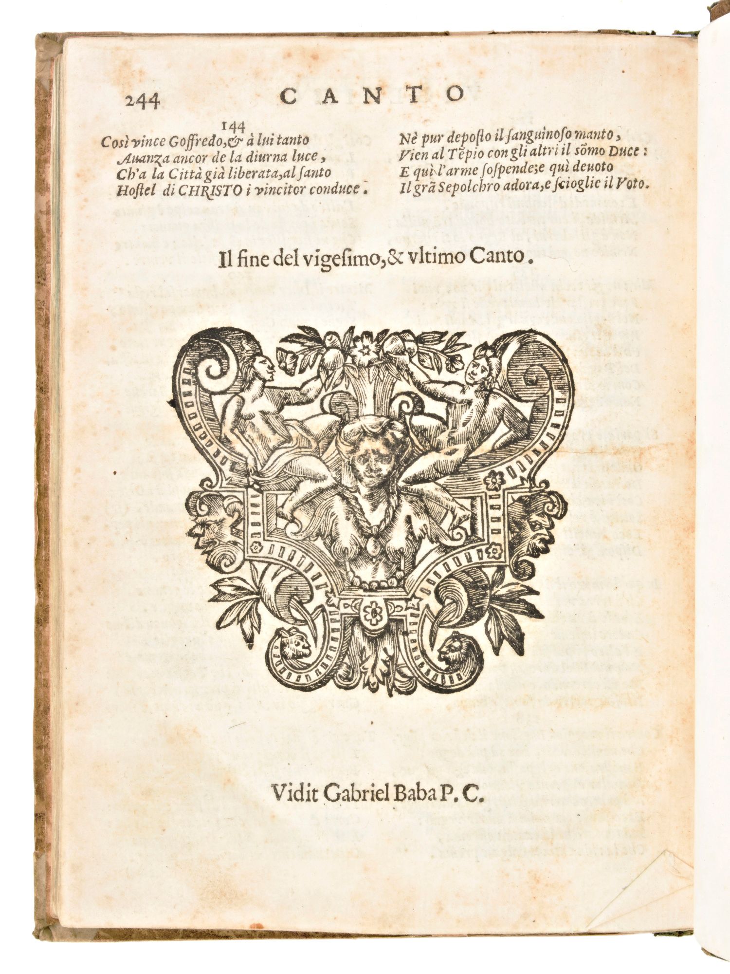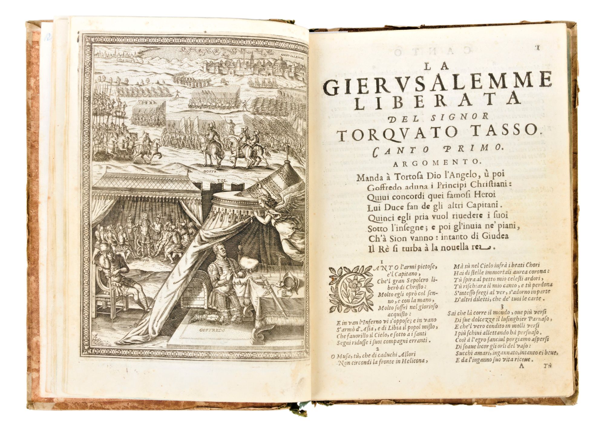 Splendida edizione della Gerusalemme liberata del celebre poeta italiano Torquato Tasso (1544-1595), con 20 tavole calcografiche a piena pagina all'introduzione di ciascun canto del poema. Testatine, capilettera e finalini xilografici. Grande marca tipografica in xilografia al colophon.