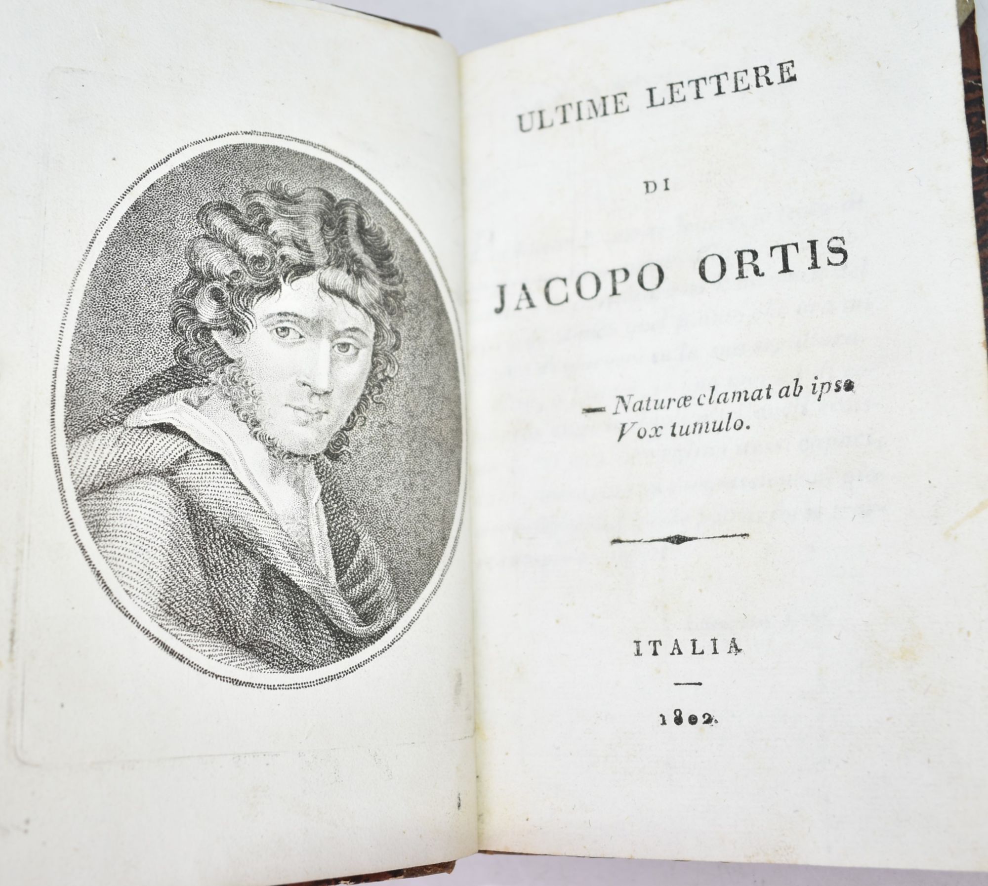 Una tra le diverse composizioni di quest'edizione datate 1802, tutte differenti per formato e numero di pagine; esemplare della variante di stampa con un ritratto di Jacopo Ortis in antiporta (non firmato), motto sul front. "Naturae clamat ab ipso Vox tumulo". Ottimo esemplare, parzialmente stampato su carta celestina; l’ultima carta è bianca.