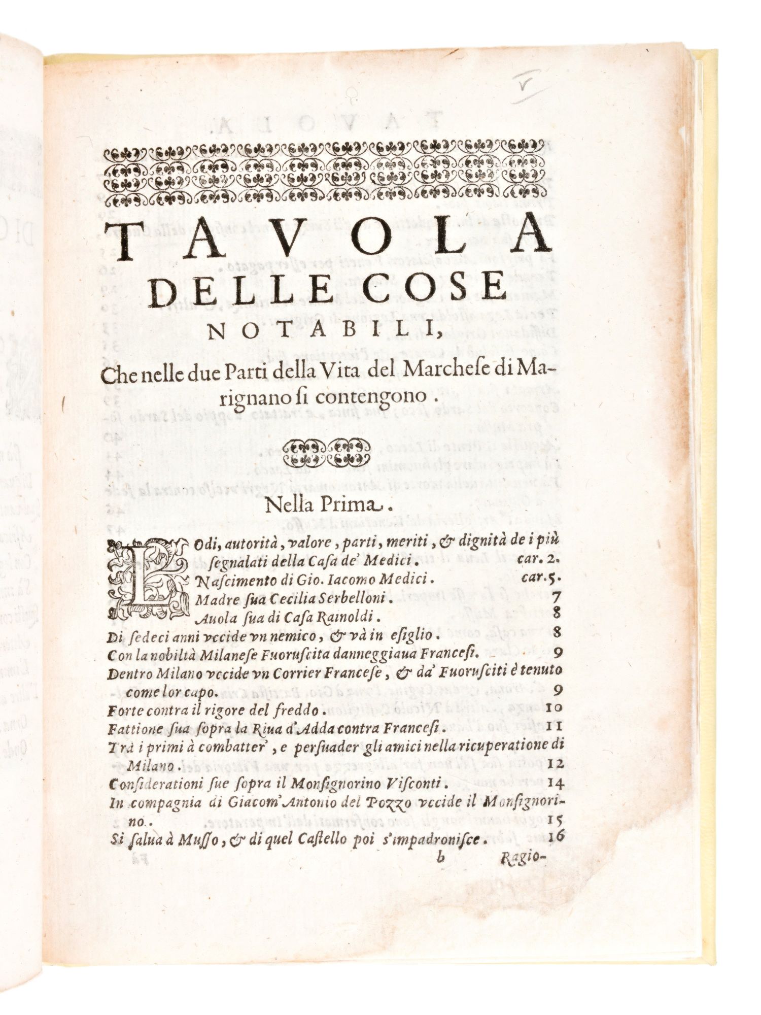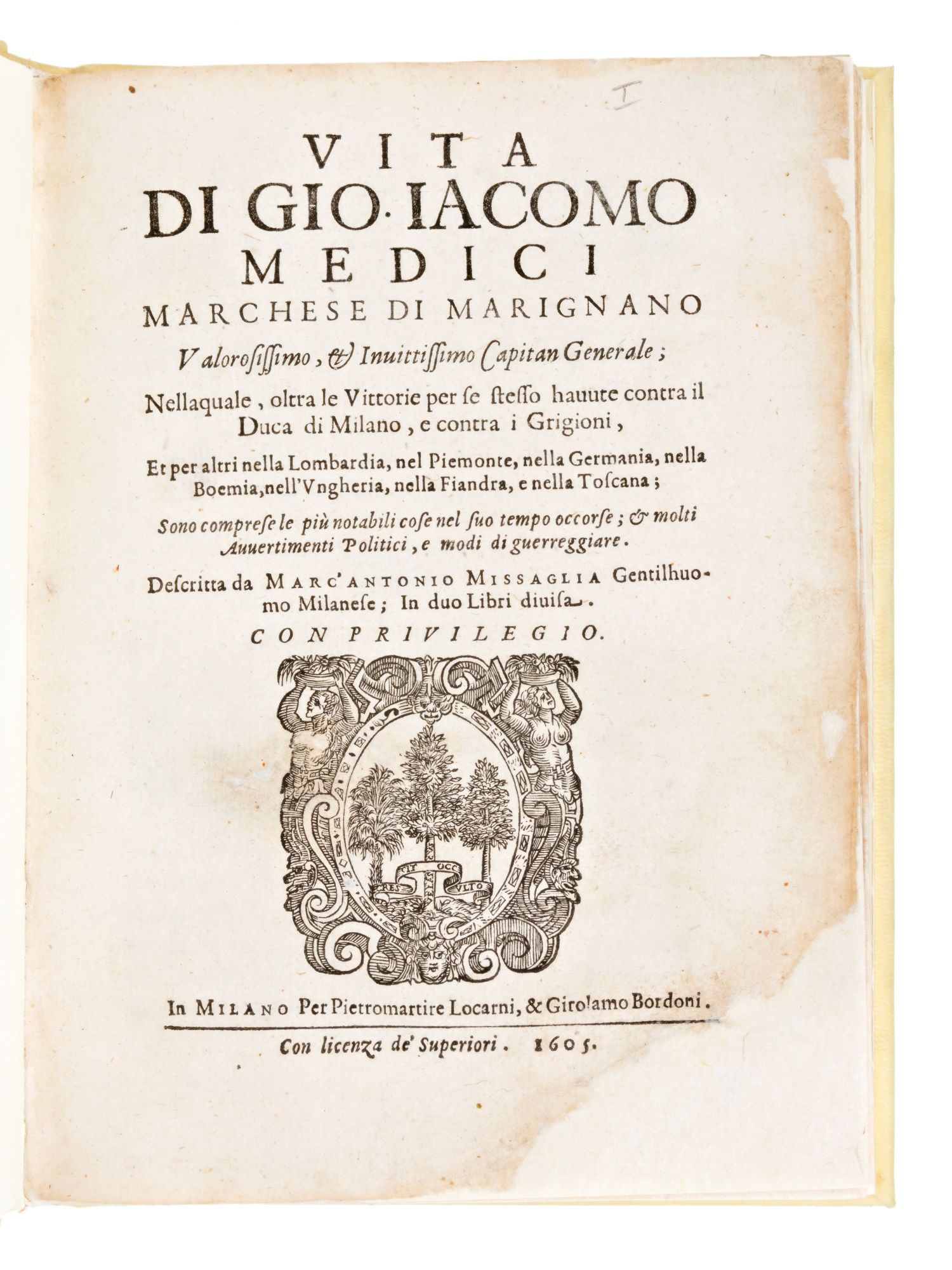 Vita di Gio. Iacomo Medici, Marchese di Marignano valorosissimo, & inuittissimo Capitan Generale; nella quale, oltra le vittorie per se stesso hauute contra il Duca di Milano, e contra i Grigioni, et ... Descritta da Marc'Antonio Missaglia... In Milano per Locarni & Bordoni, 1605. Storia e memoria del condottiero italiano Gian Giacomo Medici detto Medeghino (1495-1555), descritta in italiano dal biografo Marc'Antonio Missaglia (morte 1575). Formato in-8°, pp. (24), 194, (2). Marca tipografica al frontespizio. Testatine, finalino e capilettera nel testo. Elegante rilegatura post. muta in piena pergamena. Presenti restauri ai margini e agli angoli delle carte. Sporadiche fioriture e bruniture.