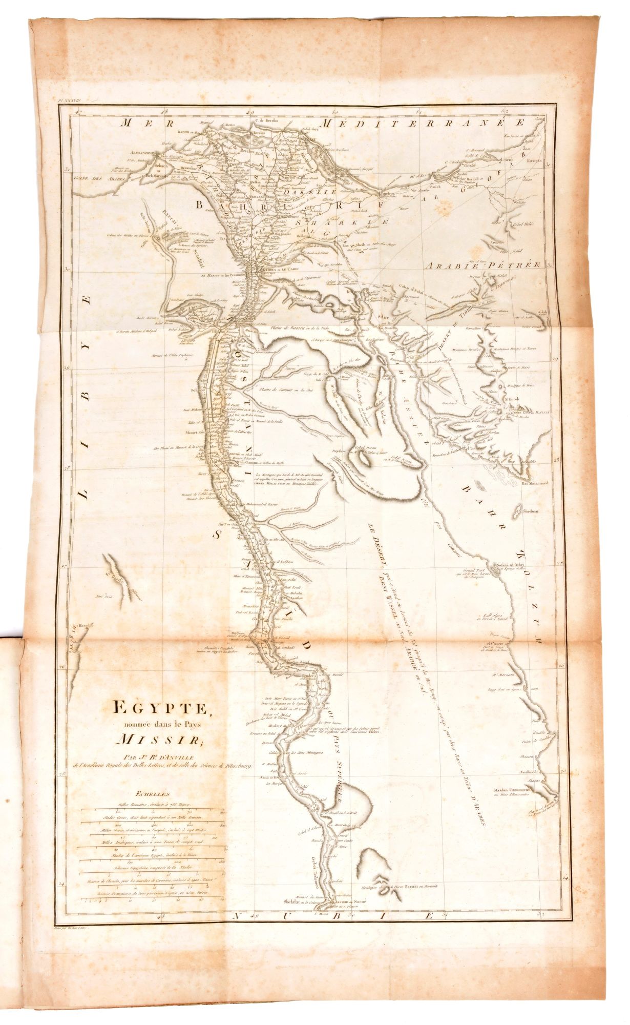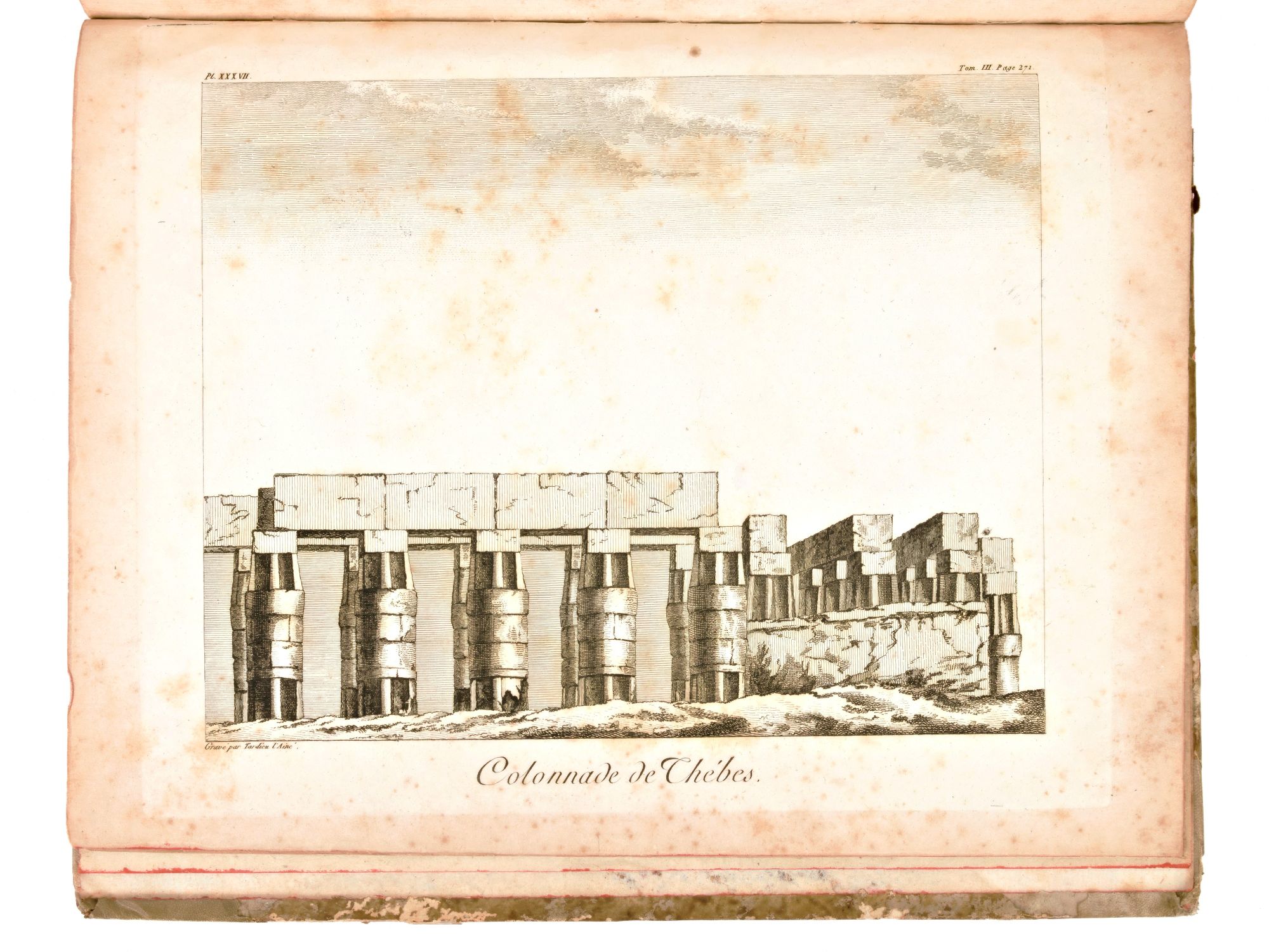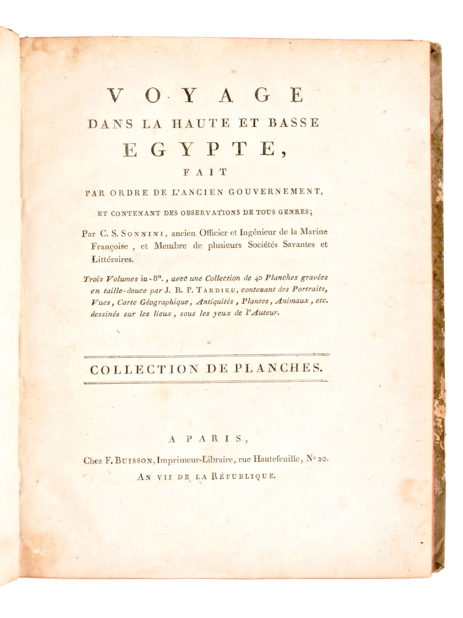 Antica edizione settecentesca, impressa in Parigi tra il 1798-1799 per l'editore François Buisson, completa in 3 volumi e l'Atlante. Spedizione in Egitto del naturalista e viaggiatore francese Charles N. C. Sonnini de Manoncourt (1751-1812), rapporti sulla geografia e sulle scienze naturali, informazioni e commenti su argomenti come la medicina, l'alimentazione, l'agricoltura, il comportamento sessuale, le sette religiose, l'architettura e la storia naturale. Atlante di 40 Tavole incise ad intaglio da J. B. P. Tardieu (1746-1816), contenenti Ritratti, Vedute, Carte Geografiche, Antichità, Piante, Animali, disegnati sul posto sotto gli occhi dell'Autore.