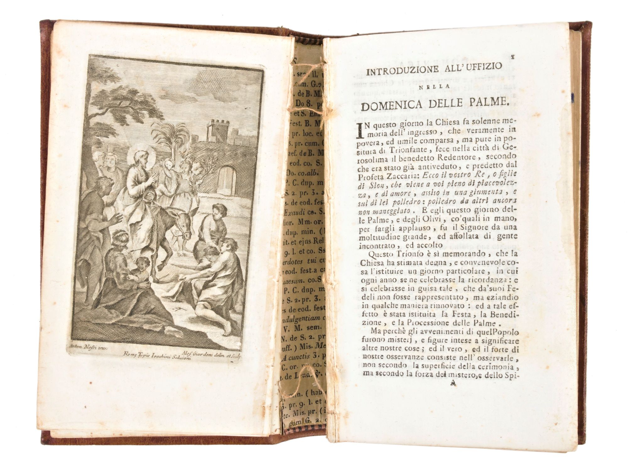 - Uffizio della settimana santa con la versione italiana di Monsi. Martini... E colle rubriche volgari, Argomenti de' Salmi ... dell'abate Alessandro Mazzinelli Roma, Perego Salvioni, 1823. In-12°, mm. 170x110, pp. (2), XII, 594, 1 c. di tav. Mancante dell'ultima carta Bb10. Cerniera anteriore distaccata, con le prime 8 carte parzialmente distaccate. Macchie d'inchiostro blu nel testo alle carte I2, I3 e al verso della c. Aa12 (piccola macchia al taglio). Frontespizio stampato in rosso e nero. Testo disposto su due colonne con la versione in latino e italiano a fronte. 1 Tavola calcografica rappresentante l'ingresso di Gesu in Gerusalemme di Antonio Nessi e Alessio Giardoni.