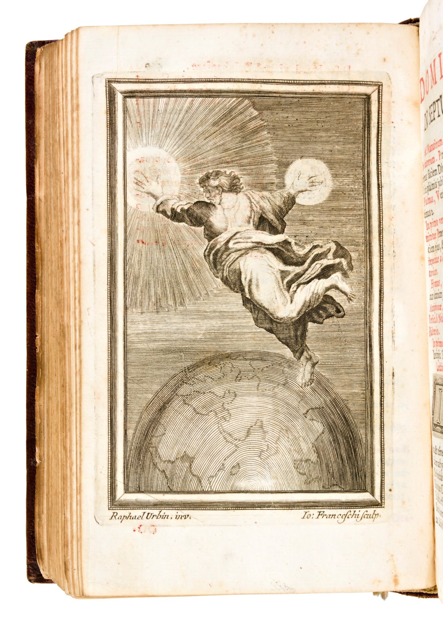 - Breviarium Romanum cum Psalterio proprio, & Officiis Sanctorum. Ad usum cleri Basilicae Vaticanae Clementis 10. Auctoritate editum. Pars hiemalis (solo il Volume 1 di 4, Parte Invernale). Urbini, Ex Typographia Ven. Capellae SSmi Sacramenti : apud Hieronymum Mainardi, il 1740. In-8, mm. 185x125, pp. (40), 764, ccxliv. Completo. Testo nitido, stampato in rosso e nero su due colonne, con alcune figure in calcografia fuori testo. Piccolo difetto alla cuffia, lievi spellature ai piatti e al dorso. Minimi segni del tempo. Frontespizio in rosso e nero con stemma papale inciso in calcografia.