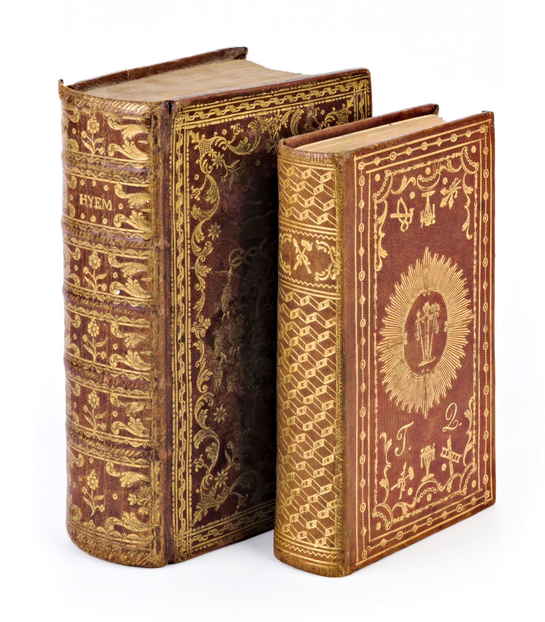 Set di 2 eleganti legature alle armi (del XIX sec.), in piena pelle marocchina con splendide decorazioni e stemmi cardinalizi impressi in oro ai piatti. Tagli delle carte in oro. Risguardi in carta antica decorativa. Contiene :