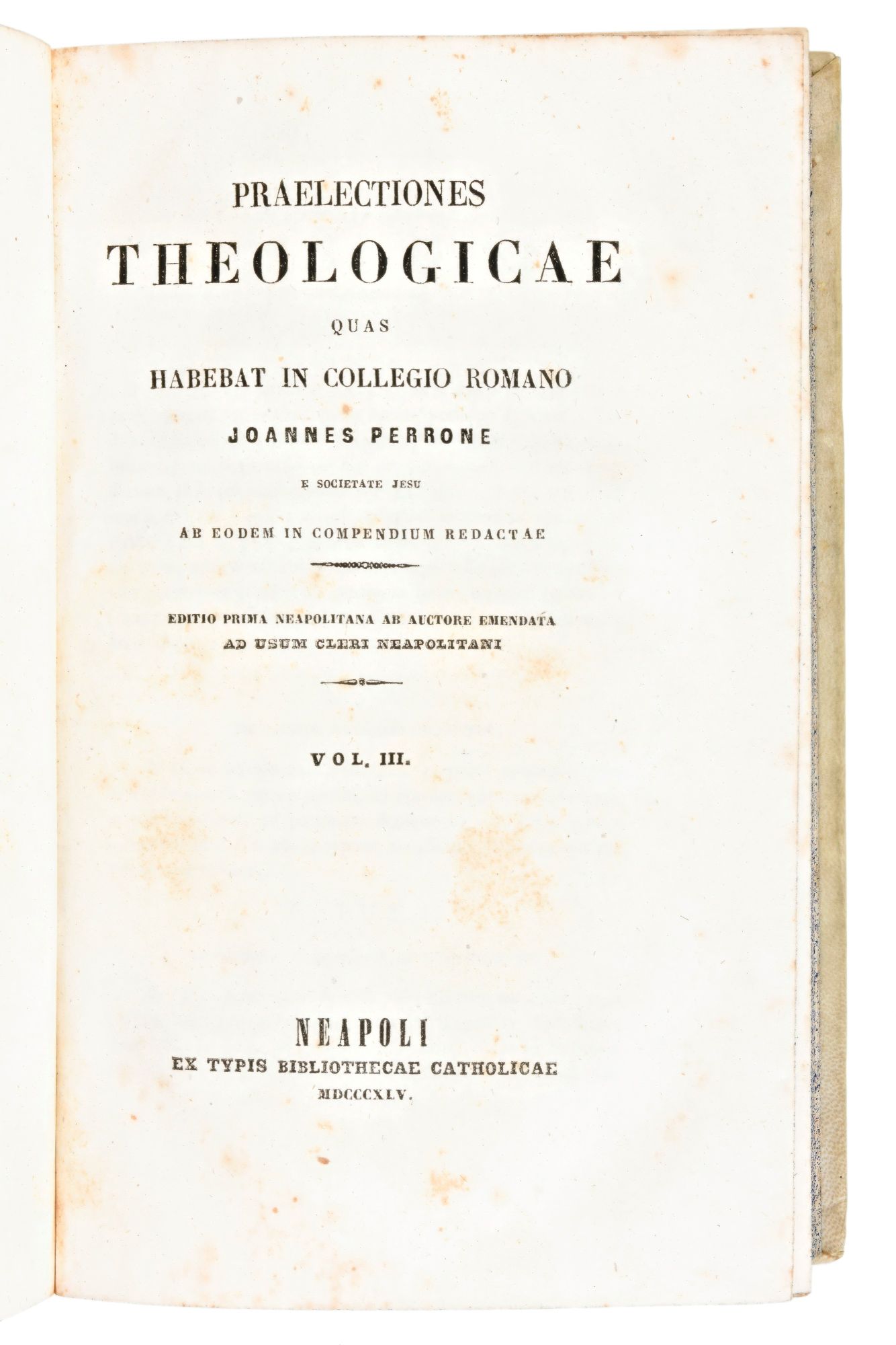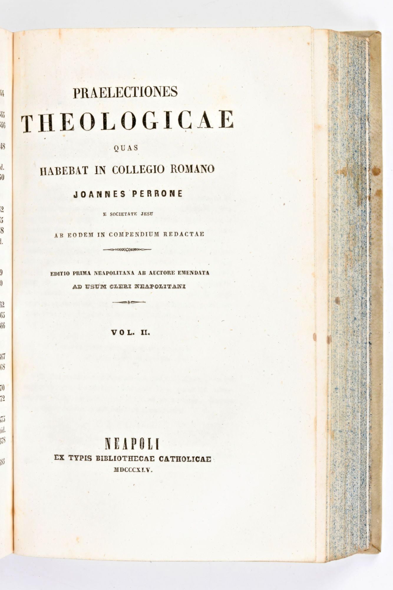 Titolo : Praelectiones Theologicae Quas habebat in Collegio Romano Joannes Perrone e Societate Jesu ab eodem in compendium redactae. Editio secunda neapolitana ab auctore emendata ad usum cleri neapolitani. Impressa in Napoli, ex tipis Bibliothecae Catholicae, 1845. Lezioni di teologia del teologo italiano Giovanni Perrone (1794-1876).