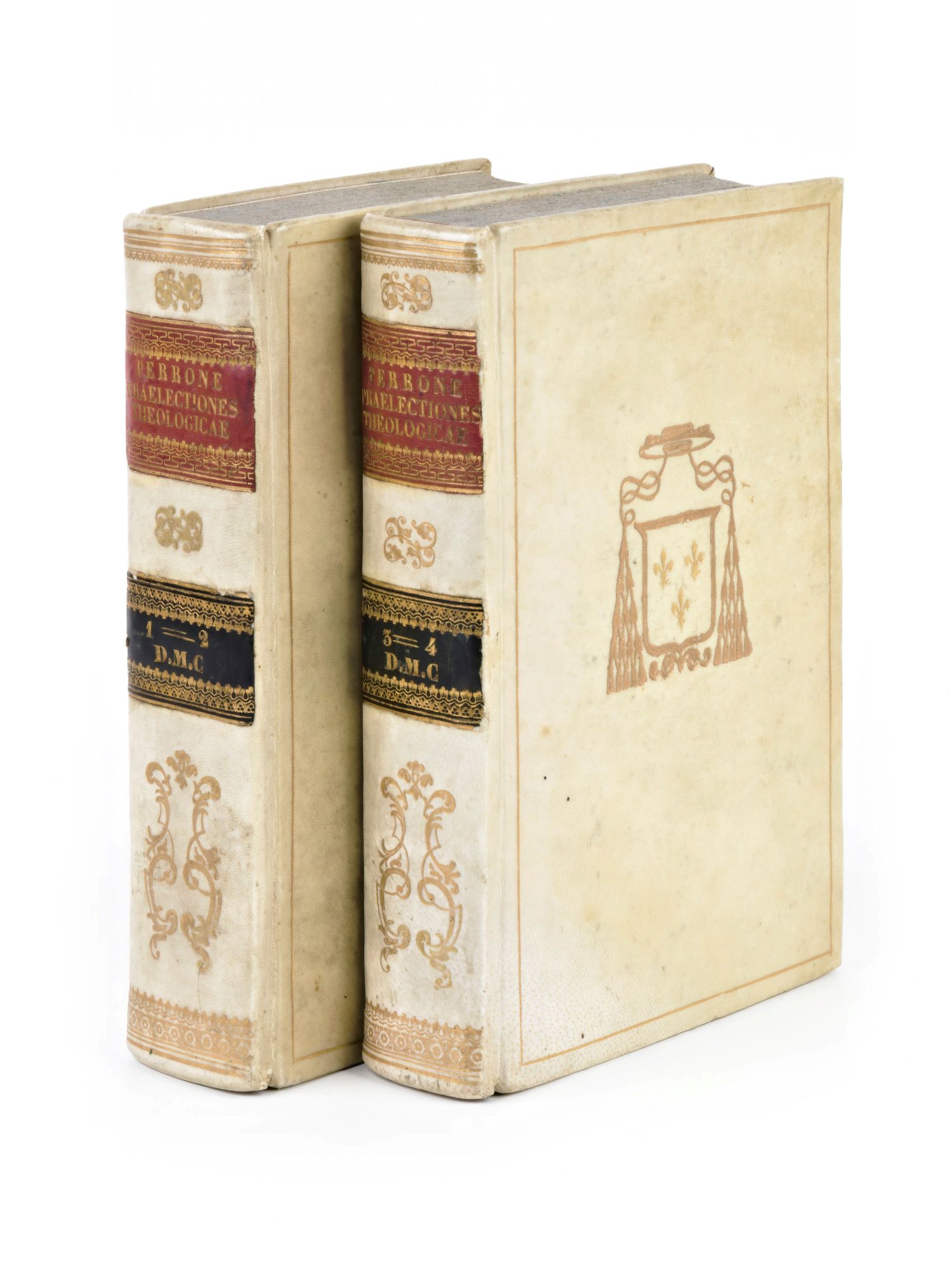 [Legatura alle armi] Perrone, Joannes : Praelectiones Theologicae quas habebat in Collegio Romano Joannes Perrone e Societate Jesu ab eodem in compendium redactae. Neapoli, 1845. Completo, 4 parti in 2 volumi.