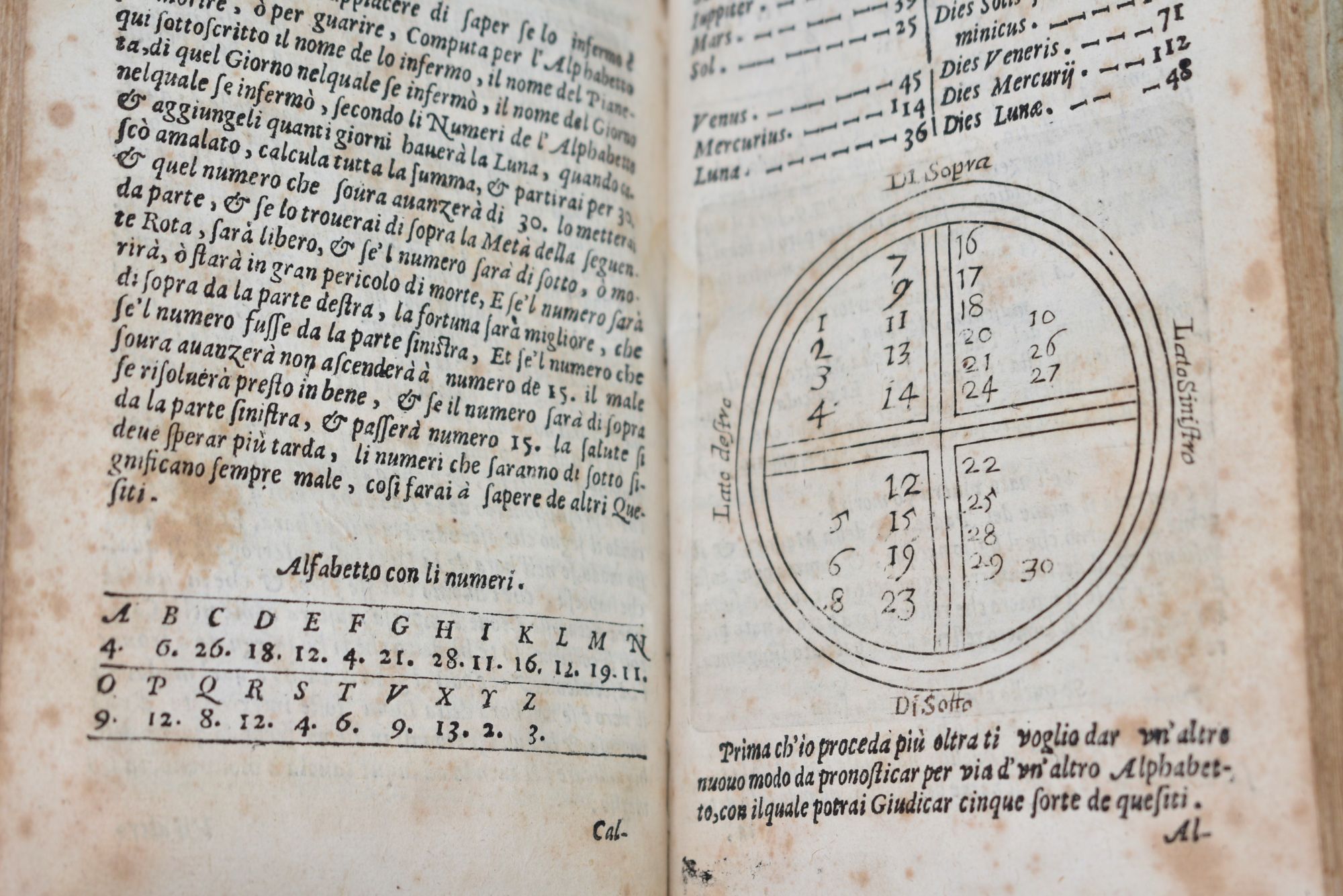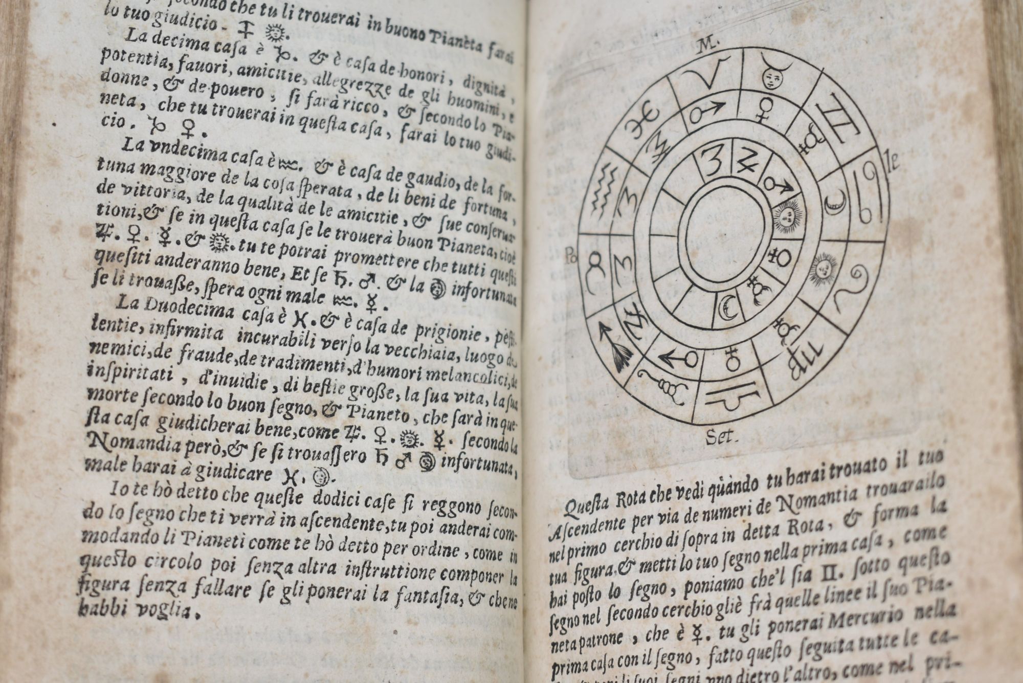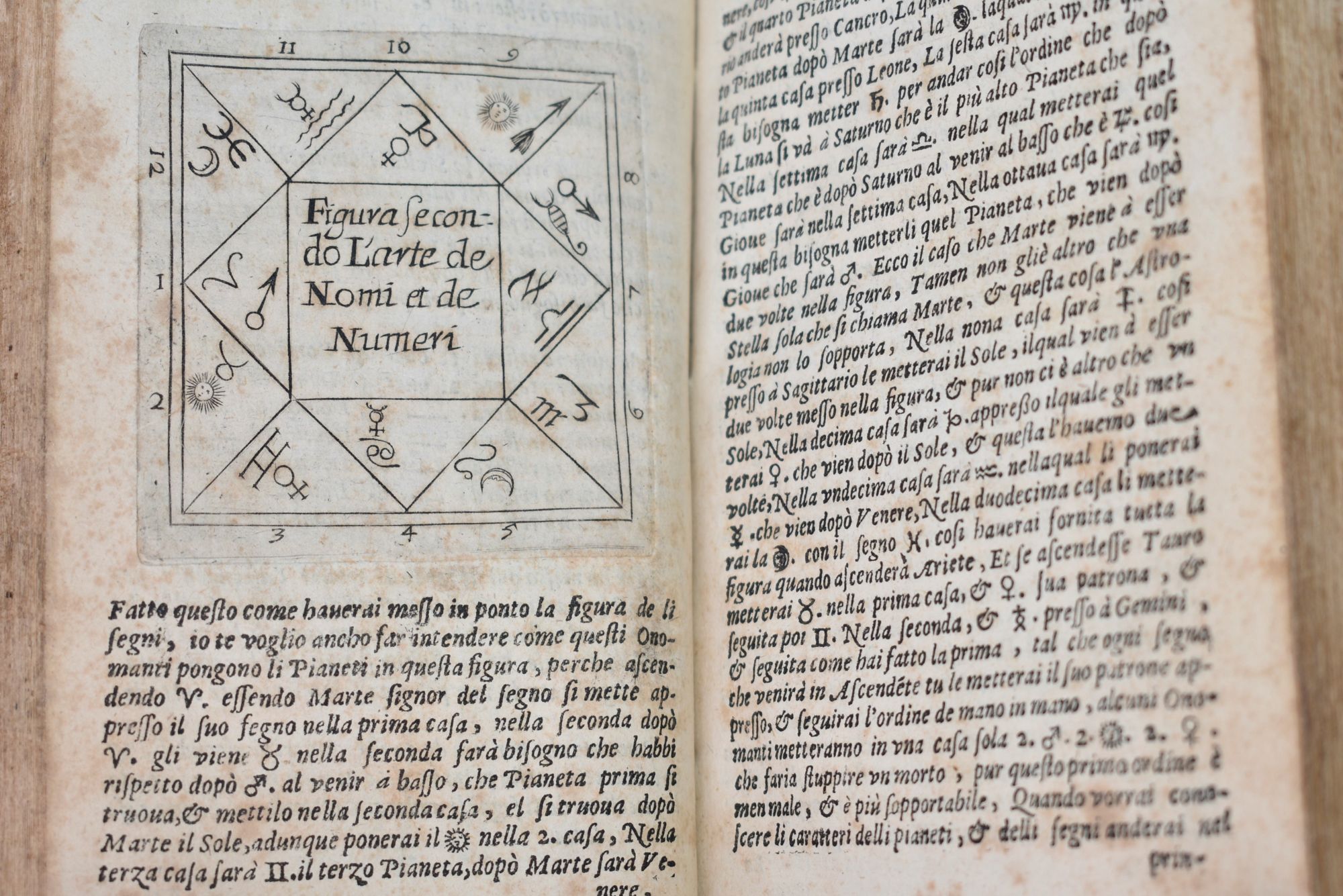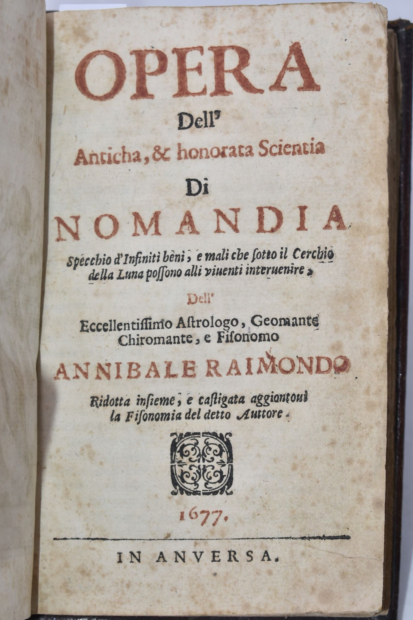 1 vol., in 8°, cm 17x11, p. 210, [2]. Legatura antica in piena pelle, muta.Figurato Seicentesco, edizione tarda (prima ed. 1549) del trattato di onomastica e numerologia di A. Raimondo (XVI sec.) con incisioni in rame raffiguranti schemi astrologici e diagrammi zodiacali; il trattato, infatti, illustra un sistema di divinazione basato sui nomi, le cui lettere hanno, secondo l’autore, un valore numerico strettamente connesso ai pianeti e allo zodiaco. Antiporta calc., frontespizio impresso a col., incisioni xil. nel testo; si conserva l’ultima carta, bianca. Lievi fioriture diffuse e sporadiche ossidazioni, ma nel complesso buon esemplare.