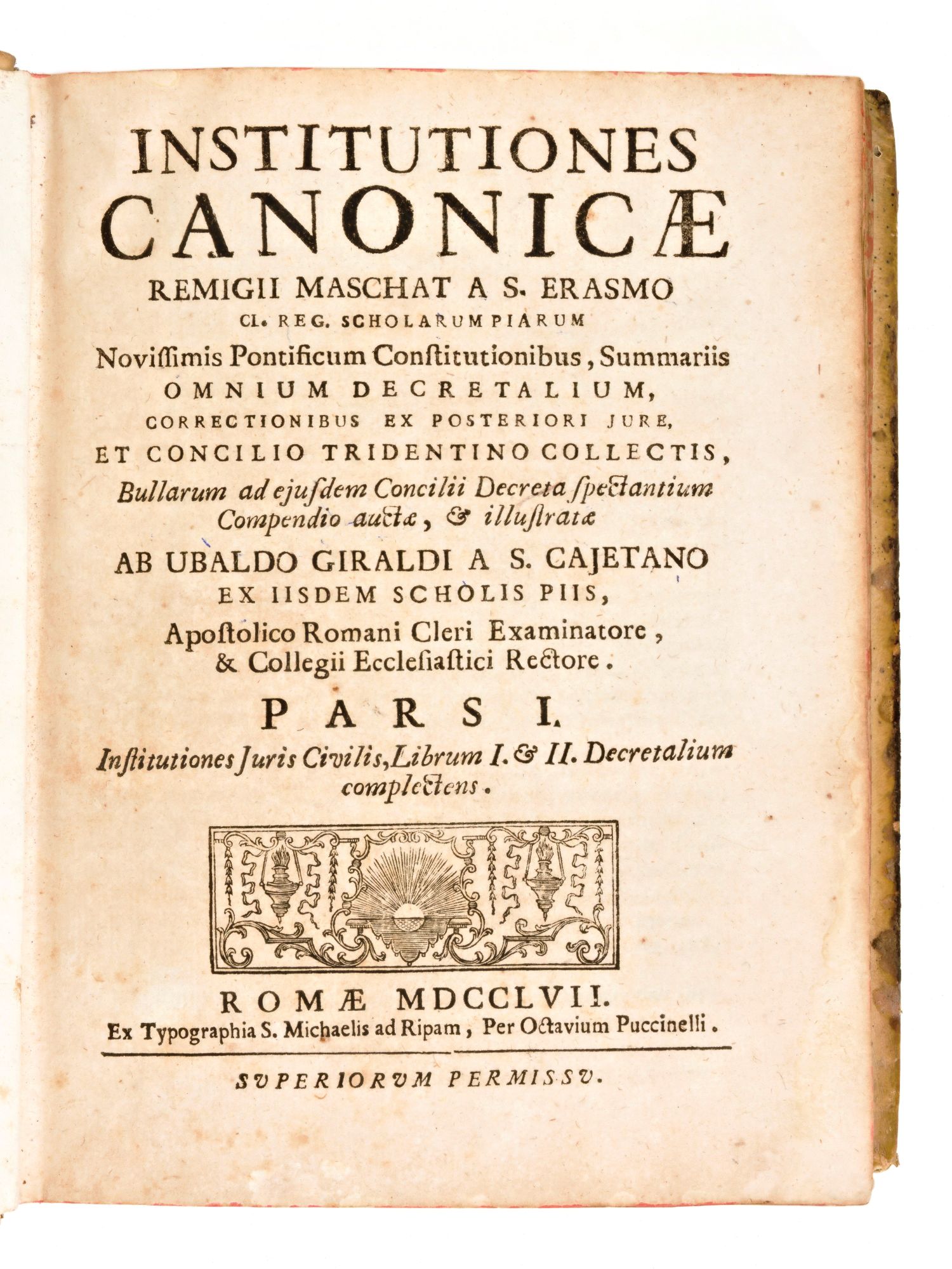 Antica edizione impressa in Roma il 1757 per Ottavio Puccinelli. Opera di diritto canonico, parte 1 (di 2) contiene: Institutiones Iuris Ciuilis, Librum I. et II. & Decretalium complectens. Istituzioni Canoniche di Remigius Maschat di S. Erasmo ... con le Nuove Costituzioni Pontificie, Sommari di tutti i decreti, correzioni dilla leggi successive, e raccolte dal Concilio di Trento, Bolle al Compendio degli spettatori dei Decreti dello stesso Concilio, aumentata dal canonico Ubaldo Giraldi di S. Caietano (1692-1775).