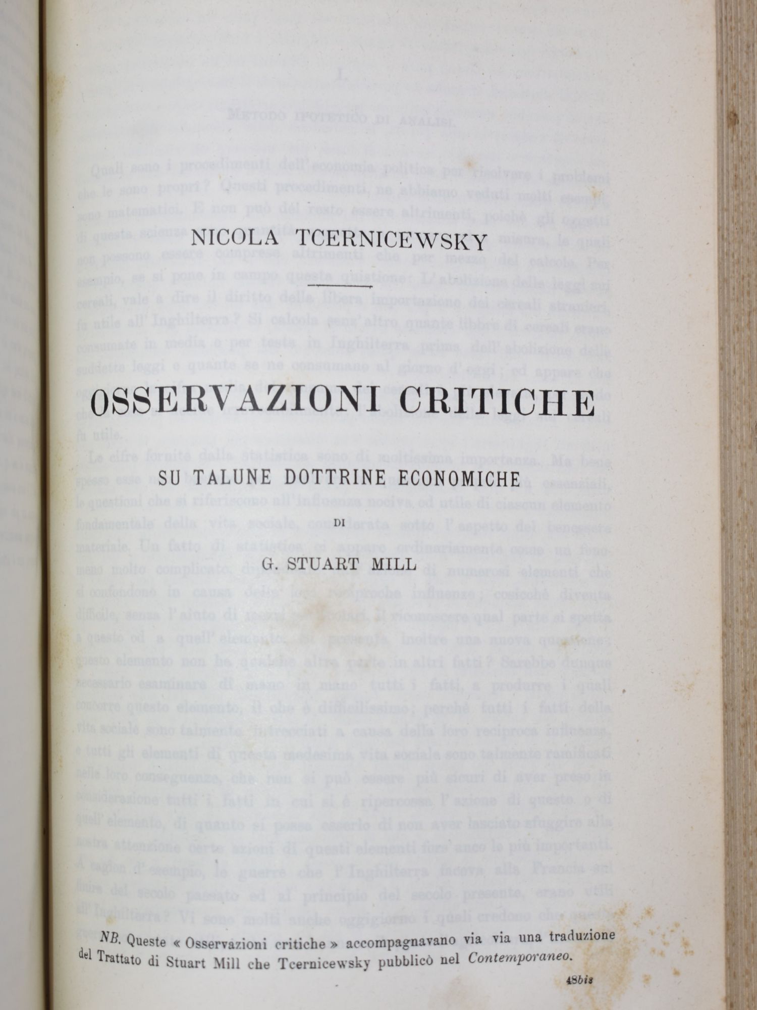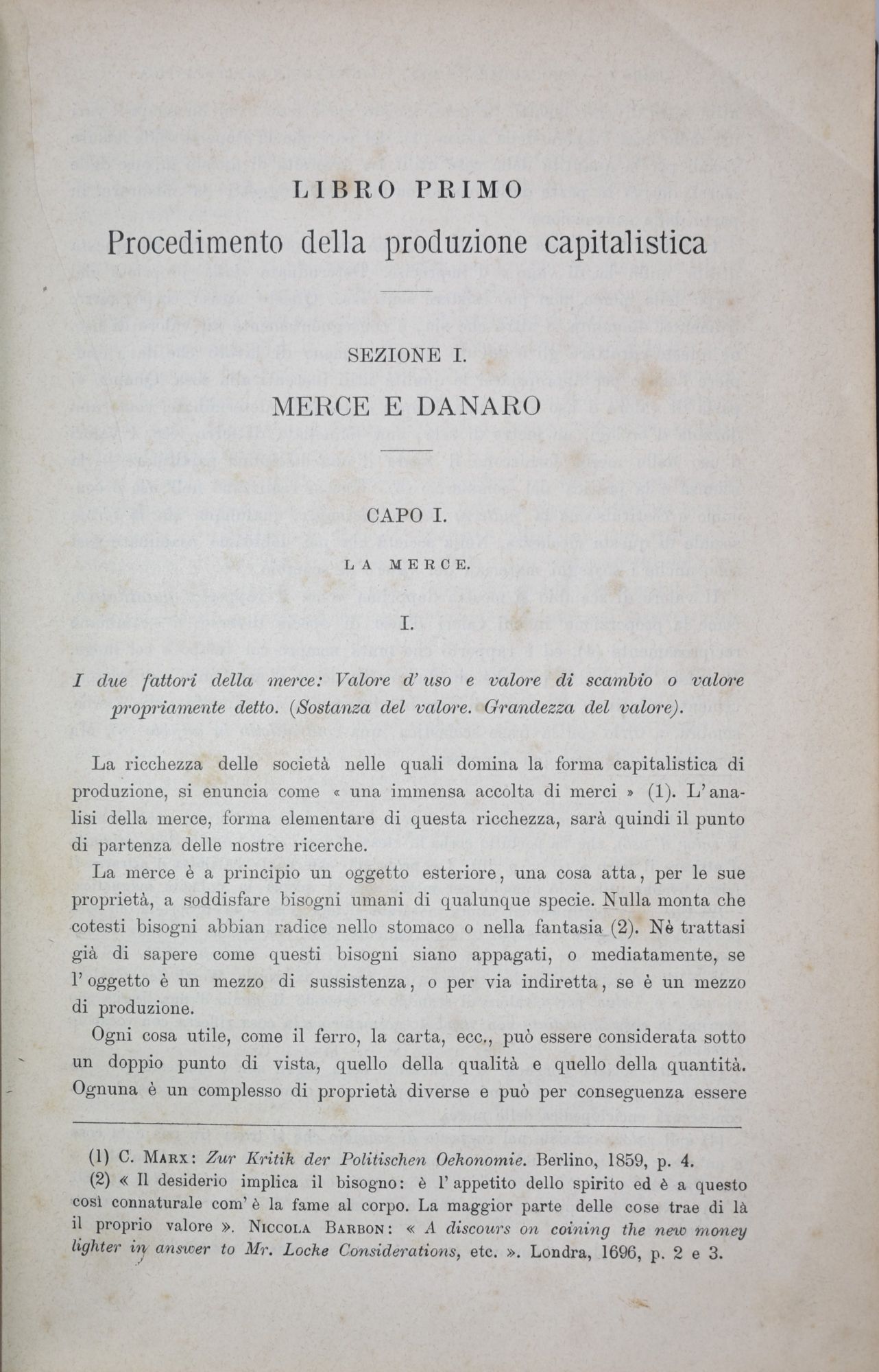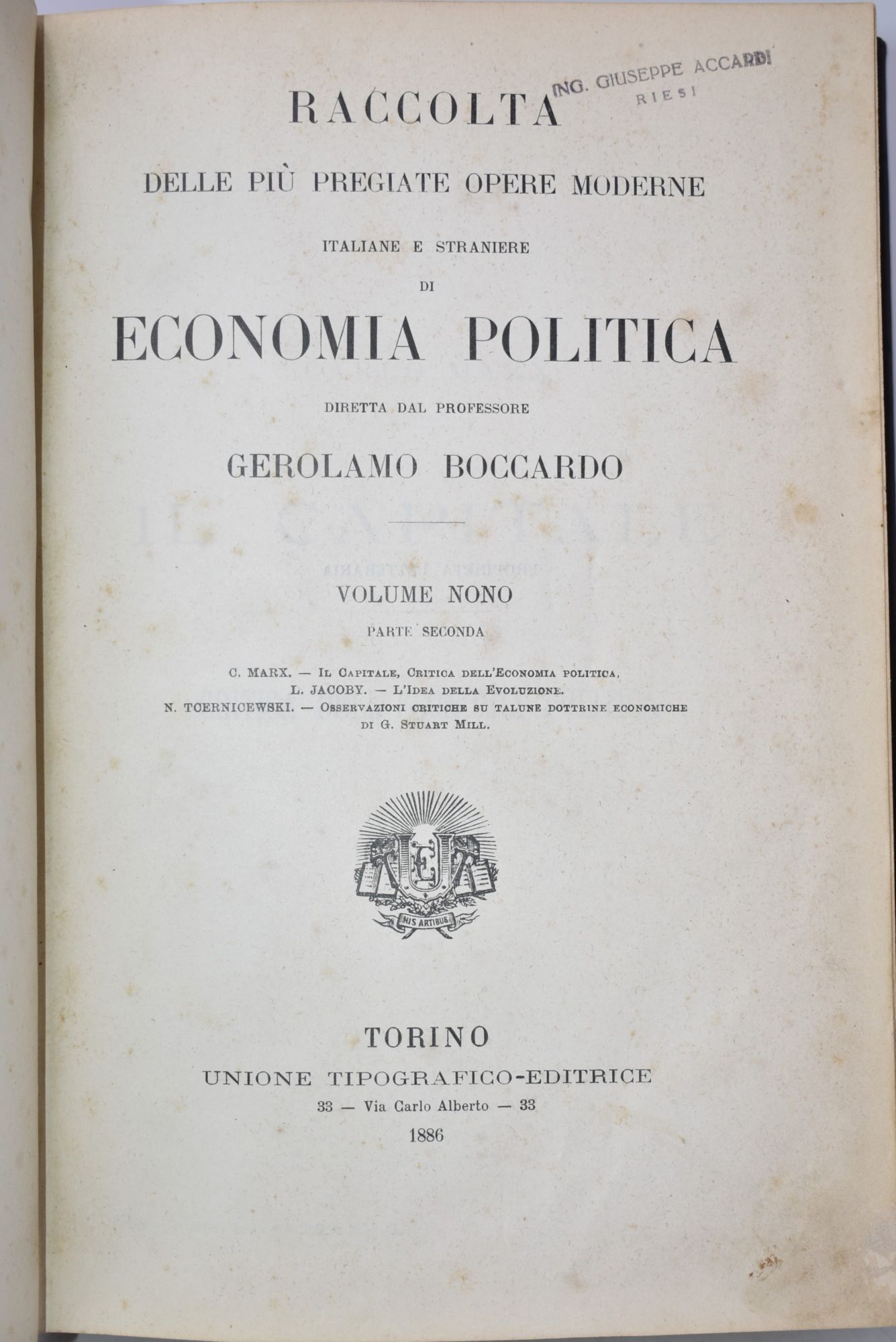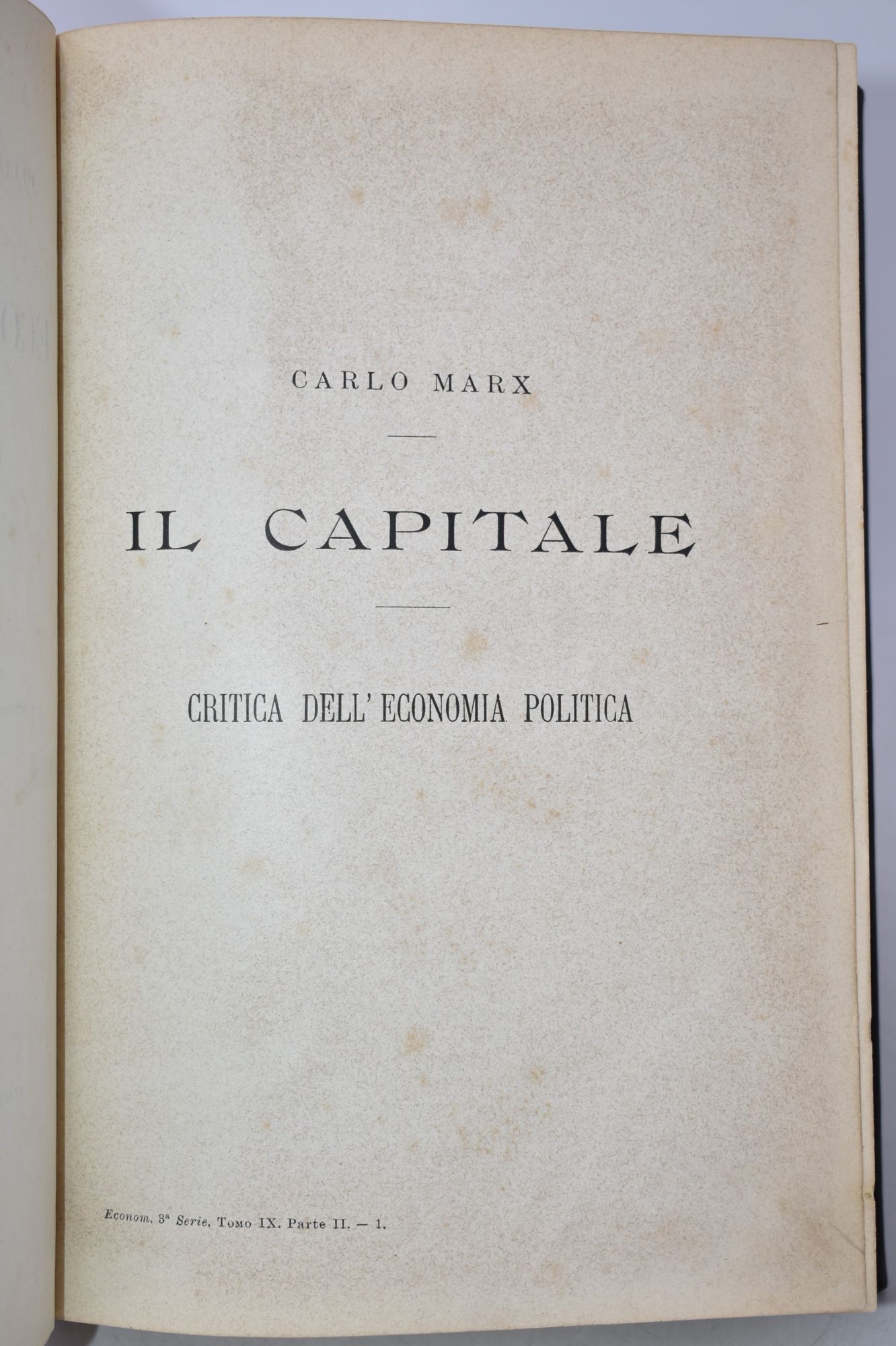 Prima edizione italiana del Capitale di Karl Marx (1818-1883), comparsa per la prima volta nella collana diretta da Gerolamo Boccardo. Il Capitale occupa le prime 685 pagine, seguono L'idea della evoluzione di L. Jacoby e Osservazioni critiche su talune dottrine economiche di G. Stuart Mill, di N. Tcernicewsky. Molto raro, esemplare eccellente.