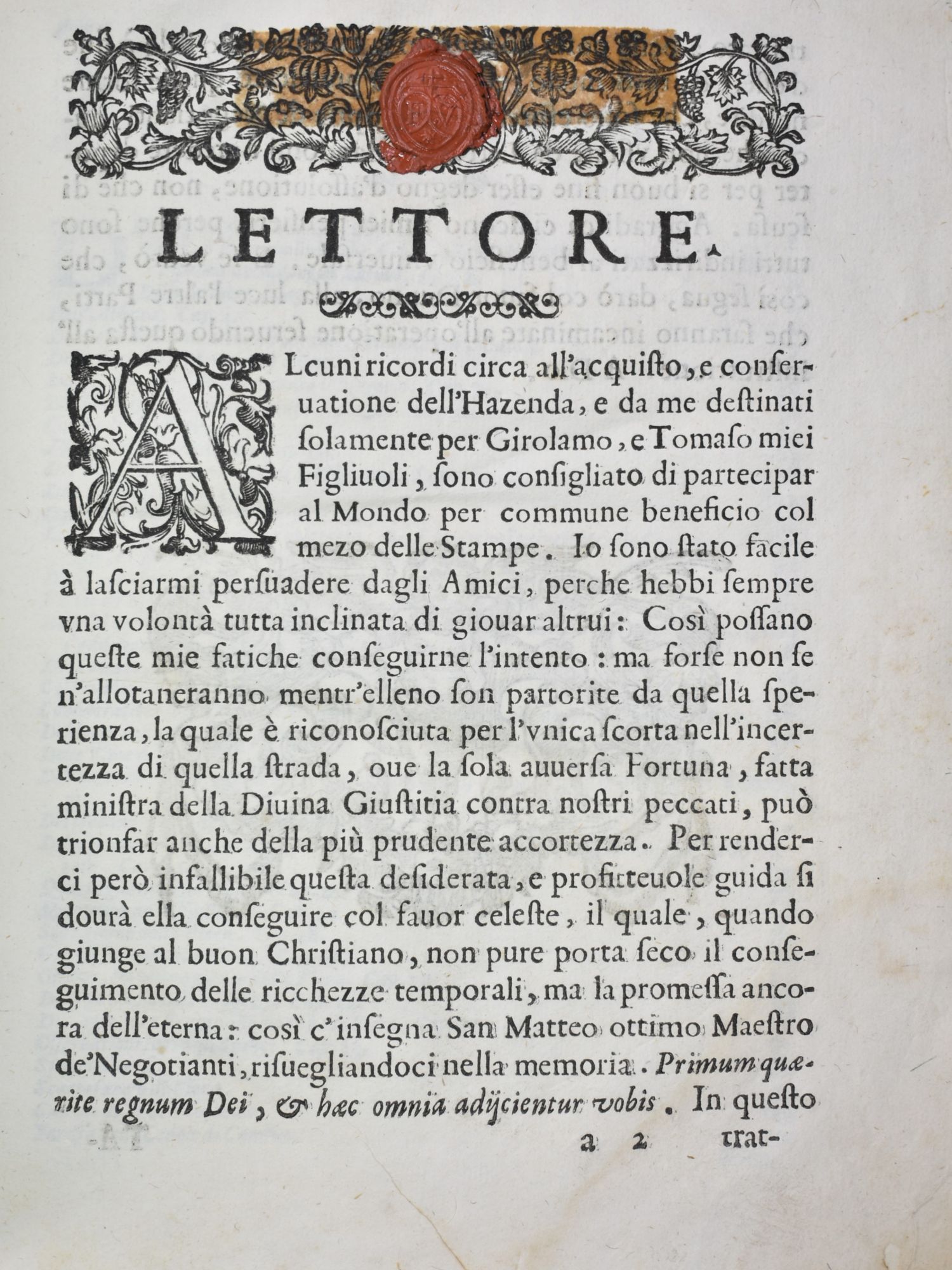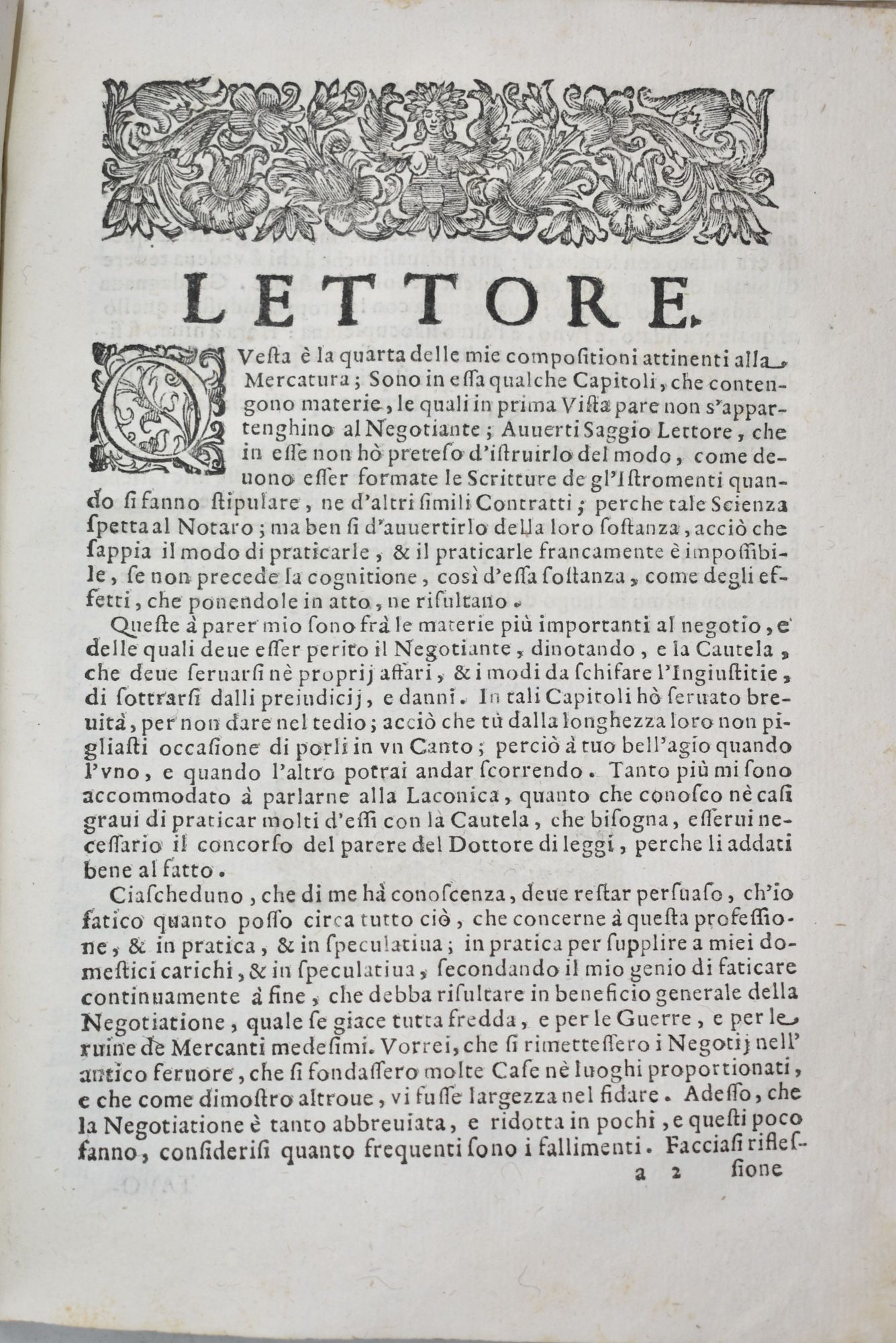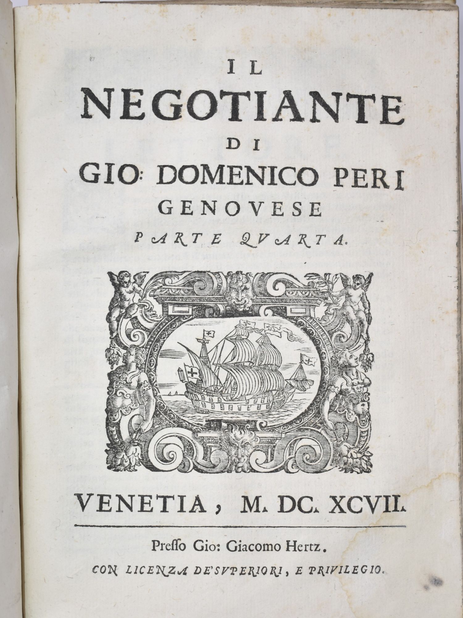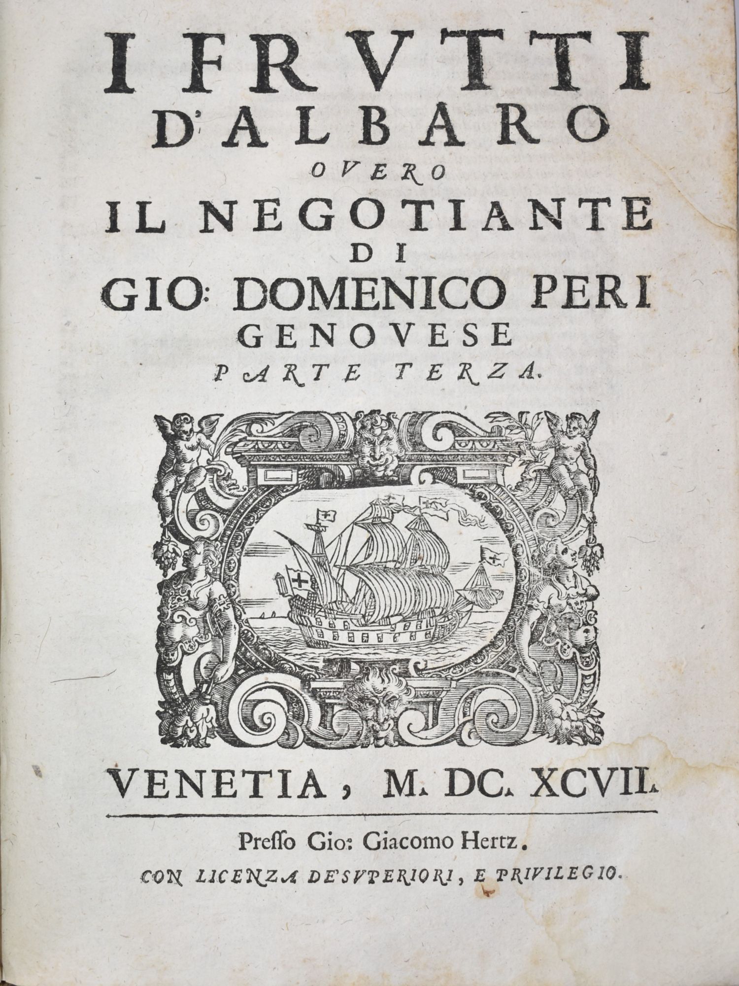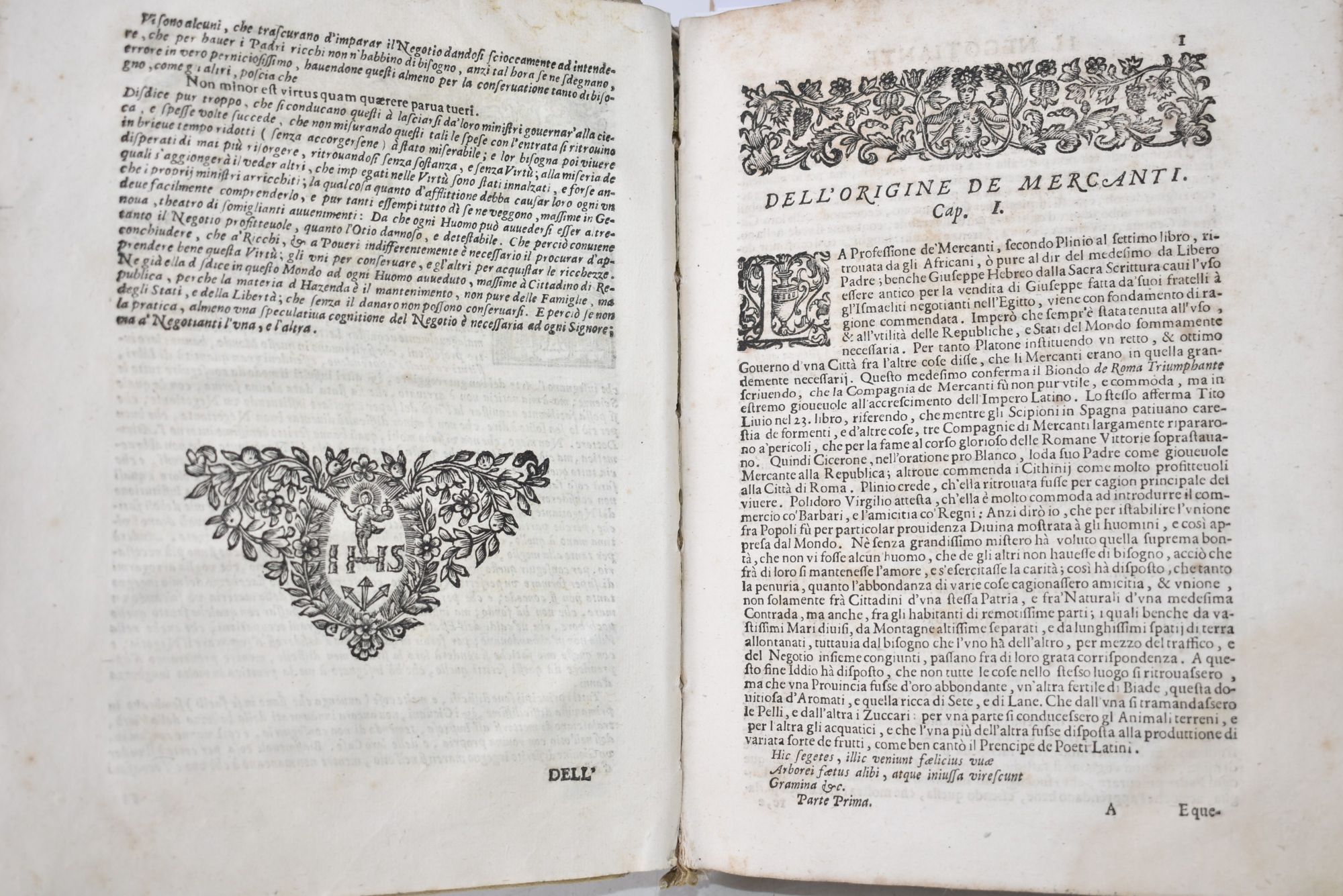 Il ricco e colto mercante genovese G.D. Peri scrisse questo trattato, “una delle opere più interessanti di tecnica bancaria” (Riccardi), basandolo sulla sua notevole esperienza personale. Le varie parti formano un repertorio completo di tecnica mercantile e bancaria, con interessanti informazioni ed utili consigli sulla contabilità, il diritto, la corrispondenza, le contrattazioni e altro. Cinque parti con front. propri rilegate in 1 volume, una grande marca tip. a ciascun front. (Veliero in mare a vele spiegate, in cornice figurata), raffinate iniziali con testatine e finalini xil. nel testo. Sul recto della seconda carta, sigillo in ceralacca con iniziali F. V. entro cruore tripartito sormontato da croce patriarcale. Esemplare fresco con lievi fioriture su poche carte, cerniere interne un po' lente.