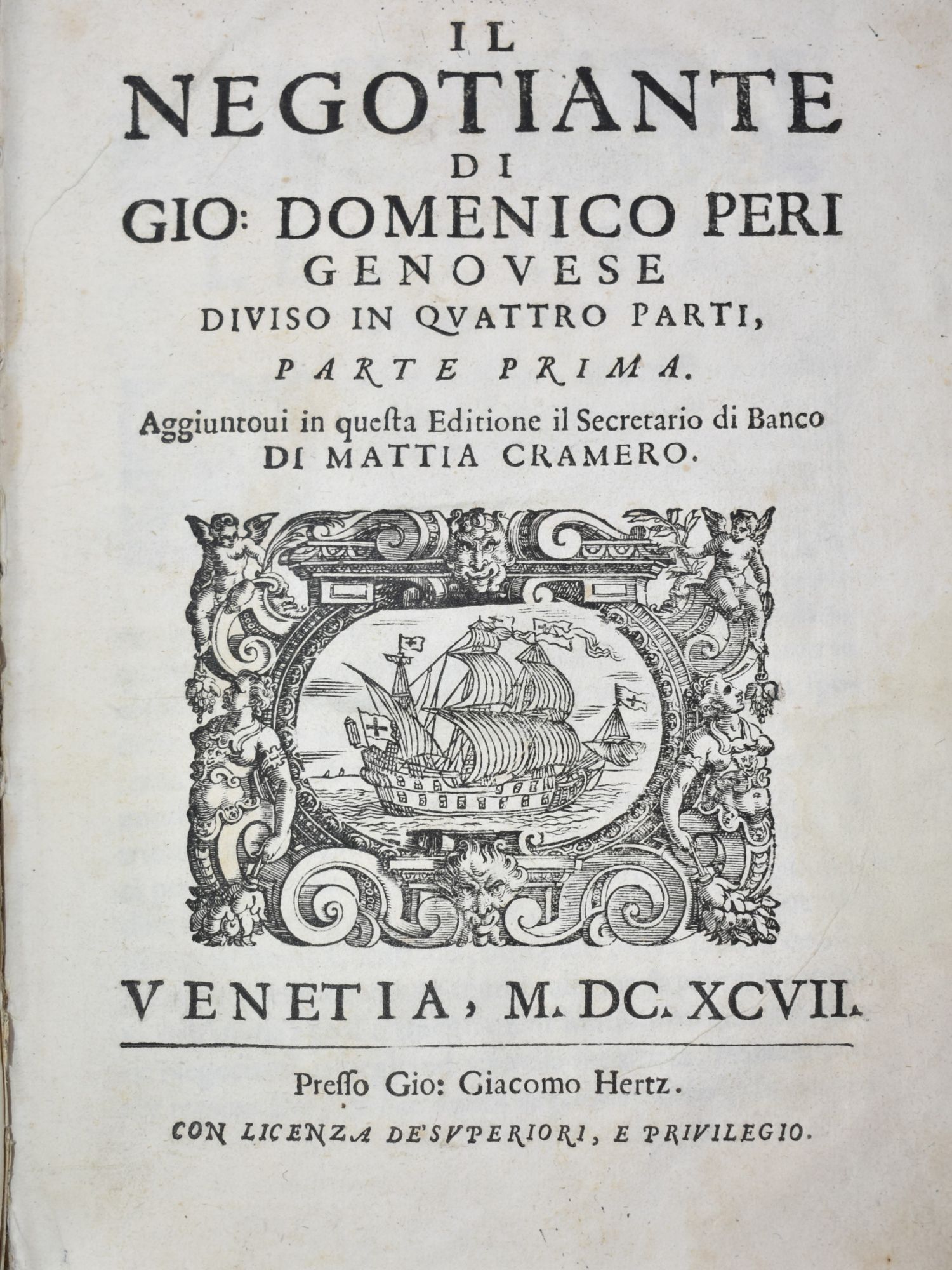 Peri, Giovanni Domenico: IL NEGOTIANTE DIVISO IN QUATTRO PARTI, PARTE I-IV. AGGIUNTOVI IN QUESTA EDITIONE IL SECRETARIO DI BANCO DI MATTIA CRAMERO. Venetia, 1697, presso Gio. Giacomo Hertz.