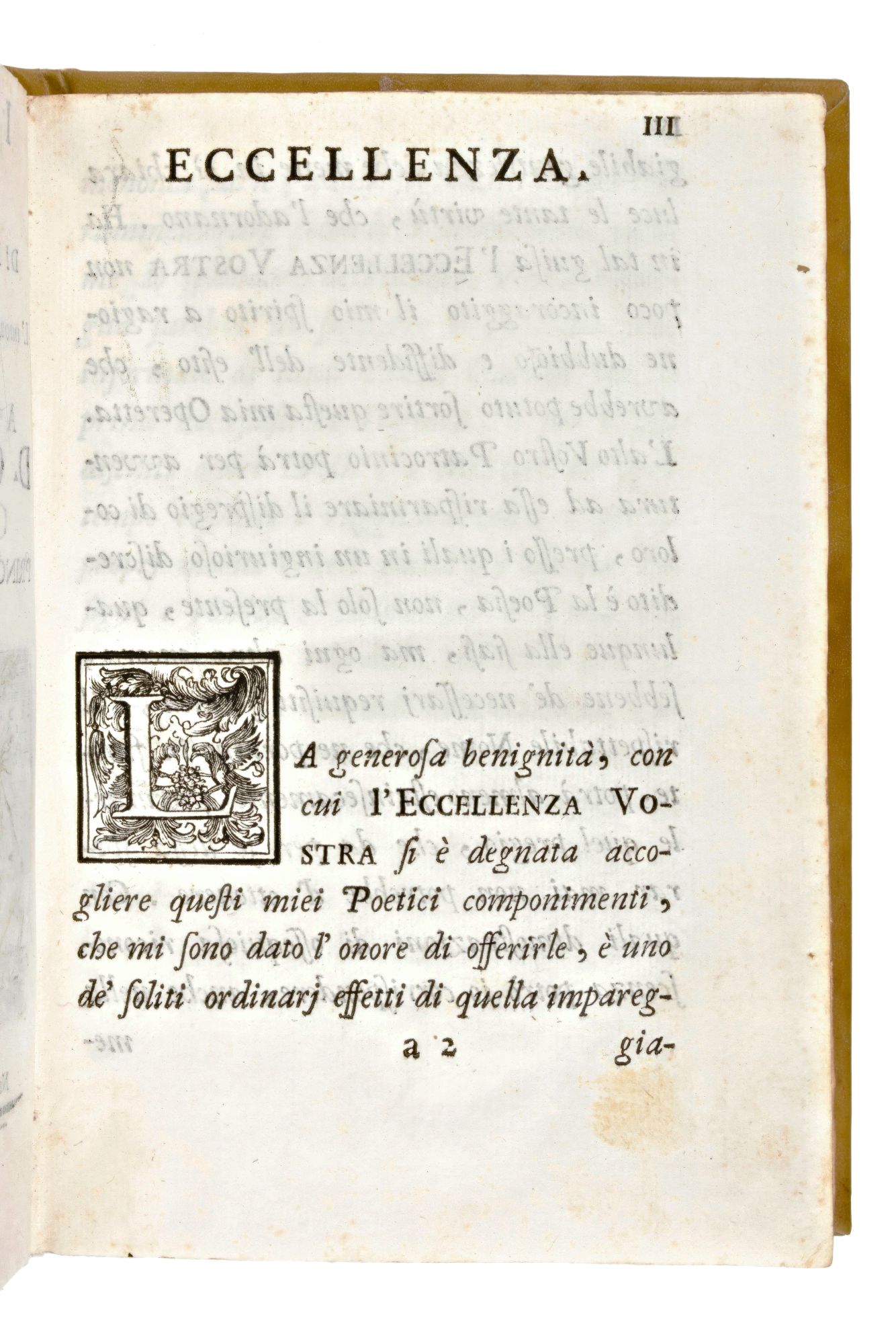 I tre giulj o sieno Sonetti di Niceste Abideno P. A. sopra l'importunità d'un creditor di tre giulj... In Roma, Bernabò & Lazzarini 1762. Rara prima edizione impressa in Roma il 1762. Vignetta calcogr. sul front. con l'impresa dell'Accademia degli Arcadi (motto : Gli Arcadi), iniziali e fregi xilogr. Rilegatura post. muta in piena pergamena. In-4°, pp. XVIII, 200, (2).