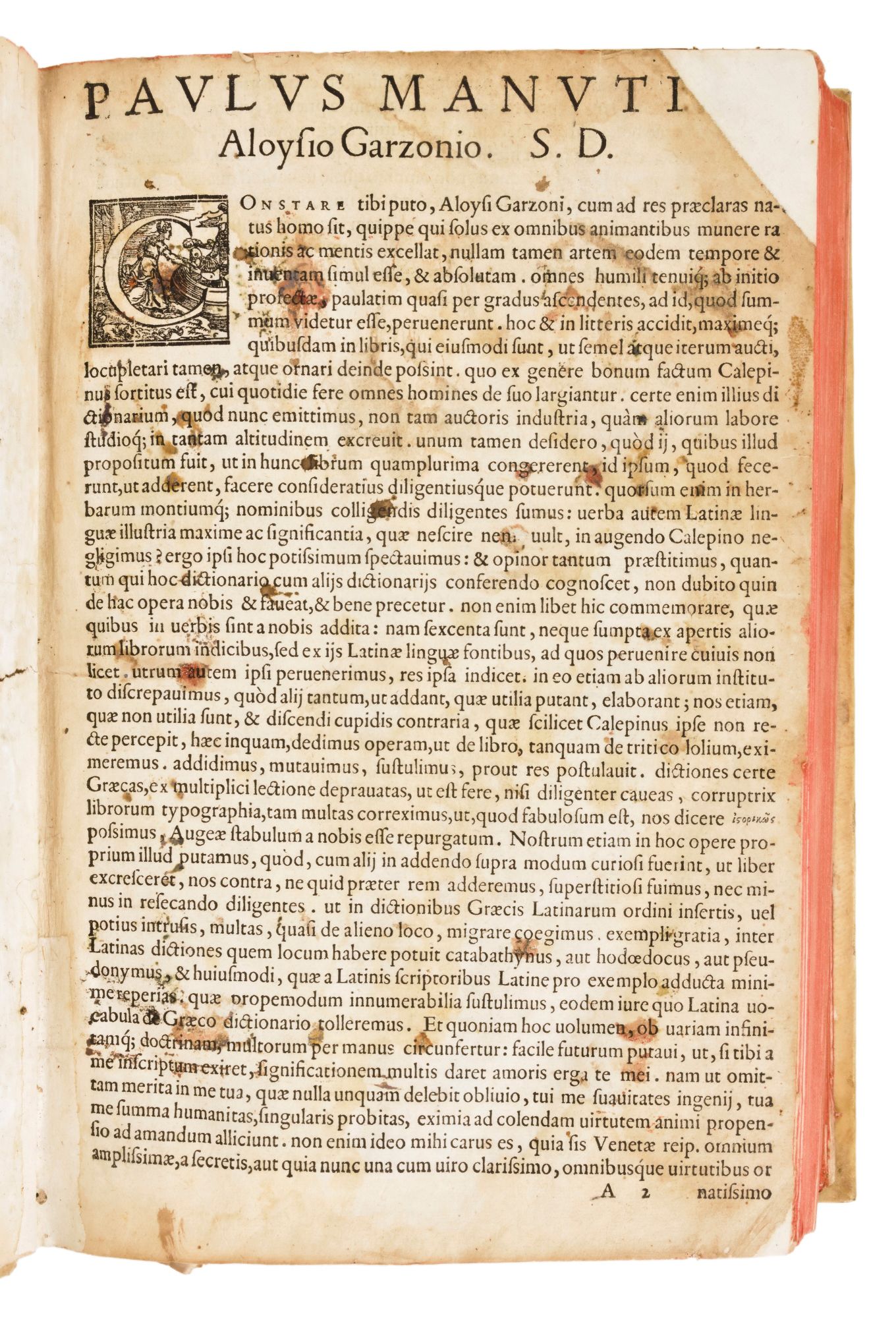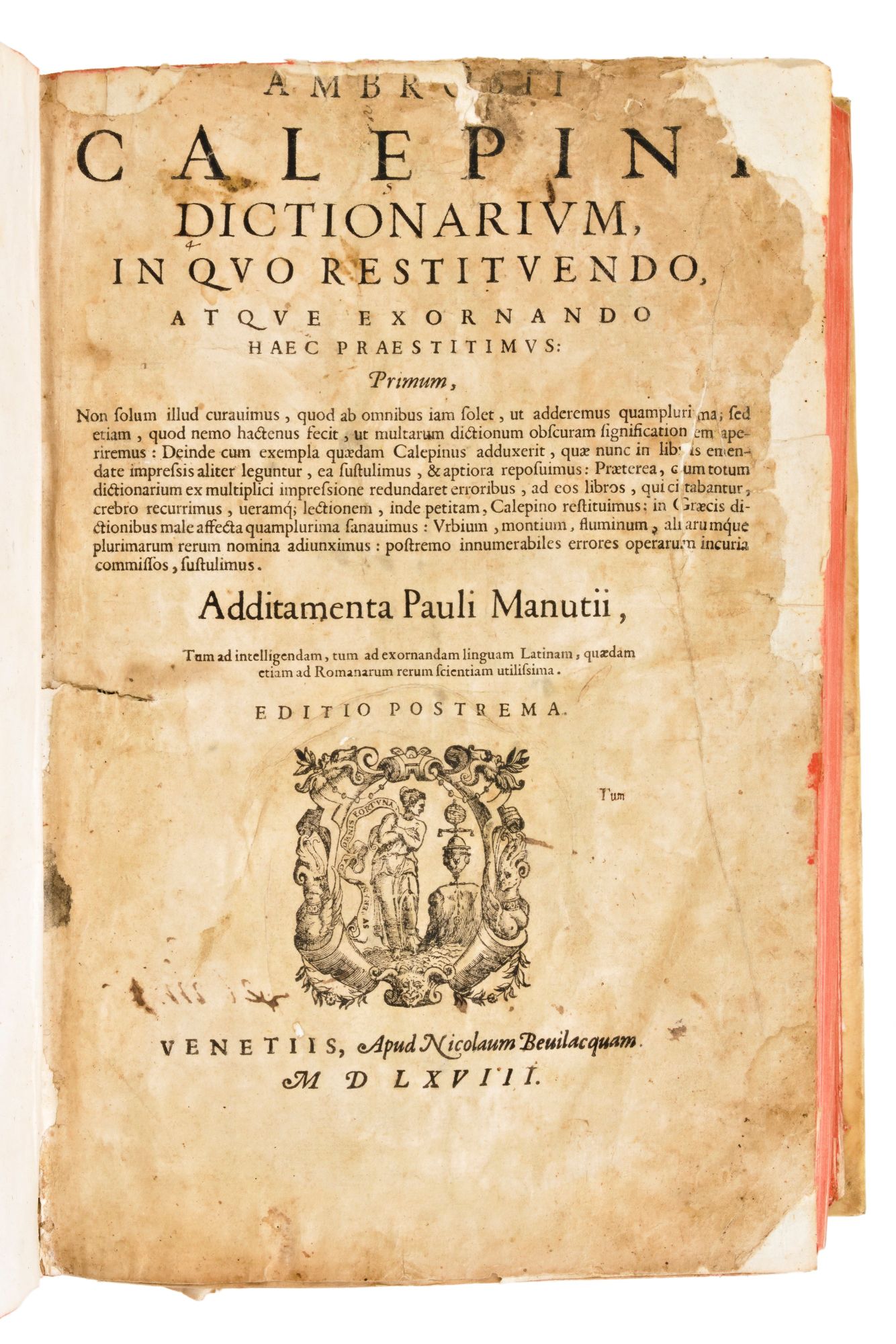 Ambrosii Calepini Dictionarium, in quo restituendo, atque exornando haec praestitimus: Primum, non solum illud curauimus quod ab omnibus iam solet, ut adderemus quamplurima; sed etiam quod nemo hactenus fecit, ut multarum dictionum obscuram significationem aperiremus... Addimenta Pauli Manutii, ... Editio postrema. Venetiis : apud Nicolaum Beuilacquam, 1568. Rilegato con : Dittionario di tutte le voci italiane, usate da migliori scrittori antichi, et moderni, tratto da' proprij scritti di M. Giouanni Marinello, & aggiunto nuouamente al Calepino. In Venetia Appresso Nicolo Bevilacqua 1568. Legatura post. in piena pergamena antica con titoli in oro su tassello al dorso. Tagli delle cc. in rosso. Formato in-8°, cm. 30x20, cc. 447 + 50. Fioriture, macchie e note in china antica, con piccole perdite di testo. Celebre dizionario del latinista italiano Ambrogio Calepio detto Calepino (c. 1435-1511) con le aggiunte di Paolo Manuzio, in fine il "Dittionario di tutte le voci italiane..." di Giovanni Marinelli. Opere edite nello stesso anno in Venezia per Niccolò Bevilacqua. Marca tipografica ai frontespizi.