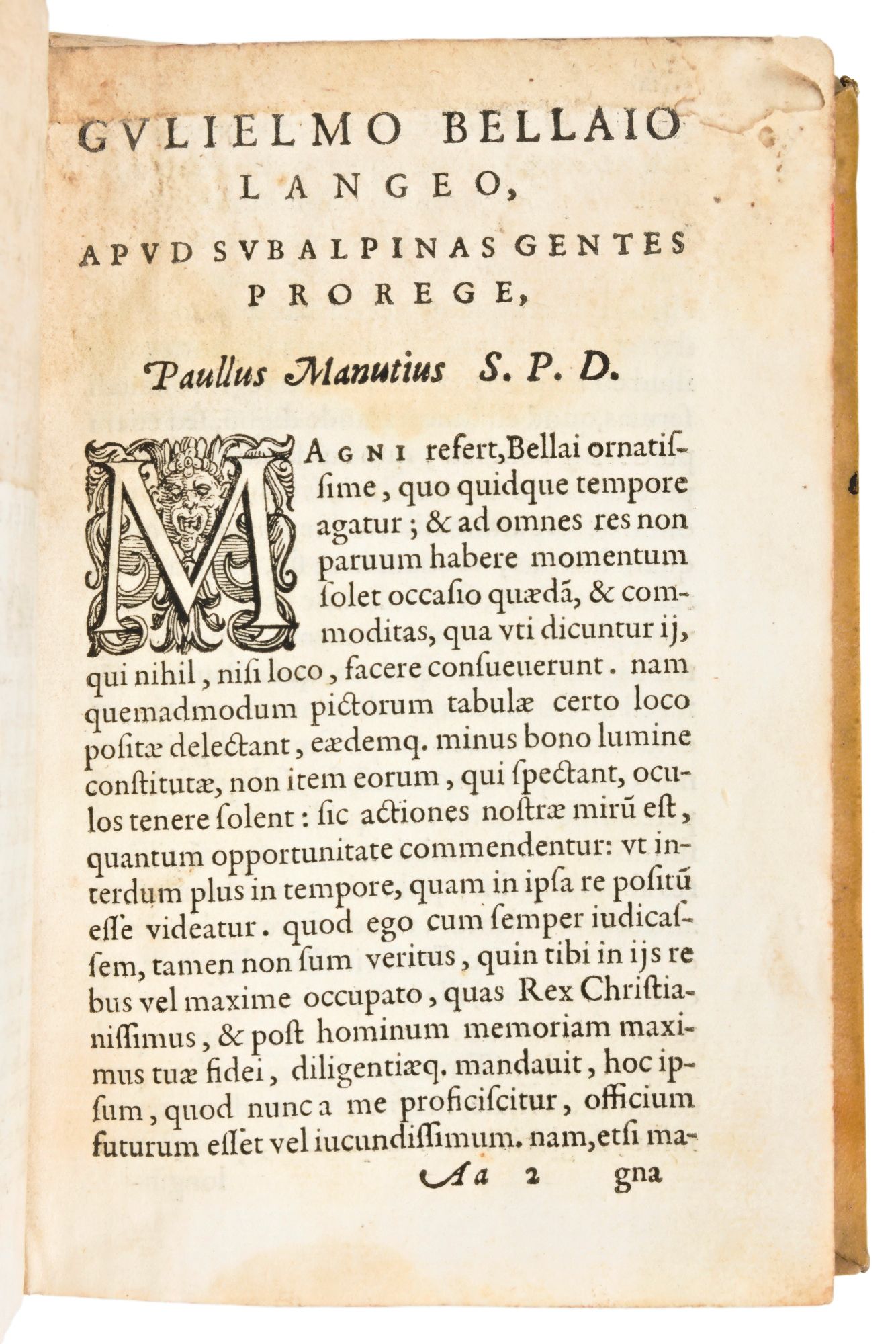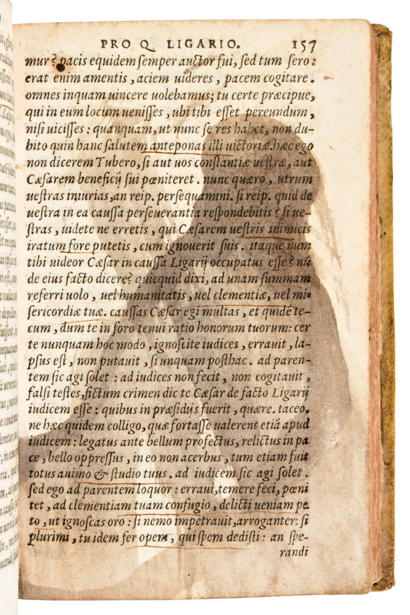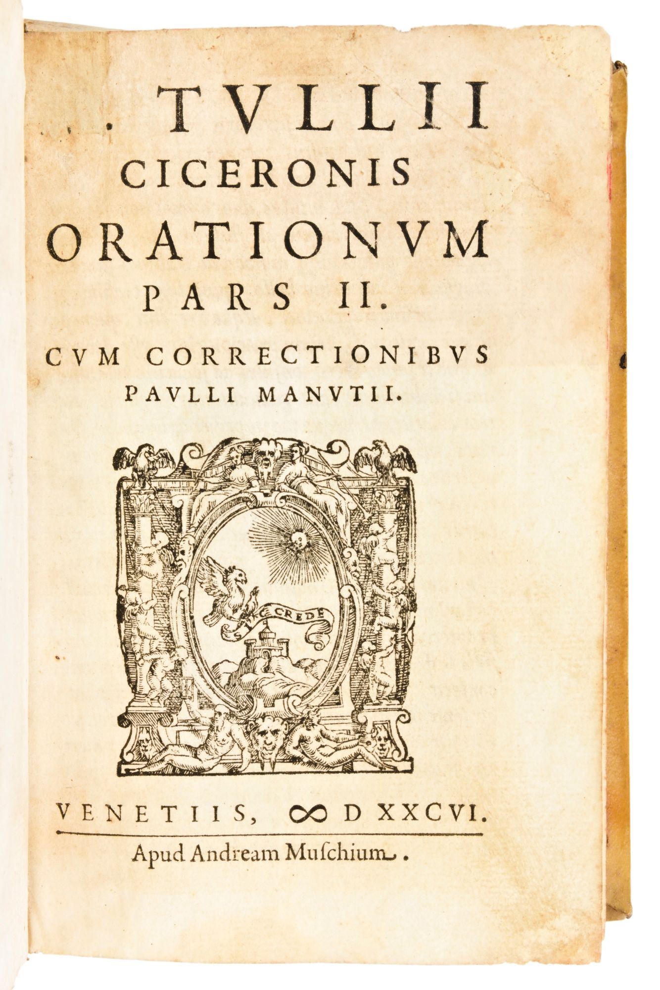 Seconda e terza parte delle Orazioni di M. Tullio Cicerone, con correzioni dell'editore e umanista Paolo Manuzio (1512-1574). Cinquecentine impresse in Venezia il 1586 e il 1559. Marca tipografica al front. Rilegatura post. in piena pergamena antica con titoli in oro al dorso. Tagli marmorizzati. Formato in-8°, cm. 15x10, pp. 629, (3) / c. (6), 291. Seconda parte con difetti alle carte Rr1, Rr2 e Rr3. Front. restaurato con piccola perdita di testo (Manca la "M." di Tullii Ciceronis). Lievi fioriture, macchie e sottolineature in china antica nel testo.