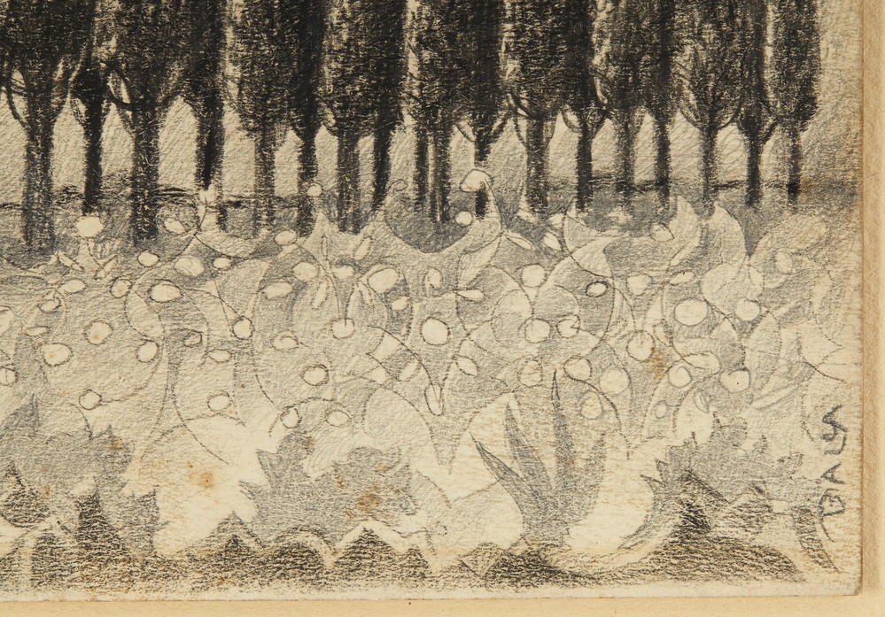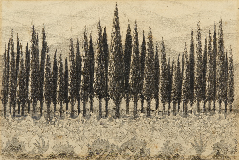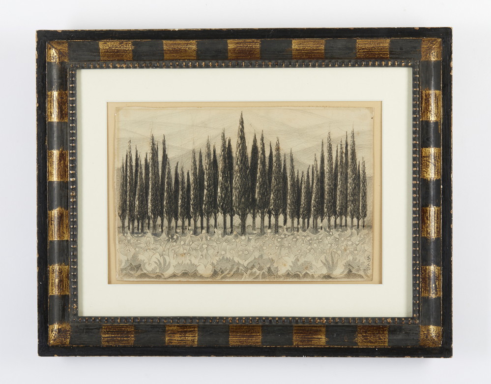 BALLA GIACOMO (1871 - 1958) CIPRESSI A COTORNIANO. 1923. matita e carboncino su carta spessa. Cm 30,00 x 20,20. firma