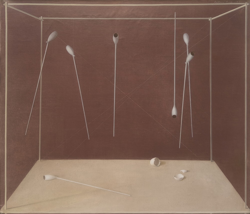 sul retro: etichette XXXIV Esposizione Biennale Internazionale Venezia 1968 (con titolo: Composizione con pipe), Mostra antologica di Antonio Bueno, Palazzo Strozzi Firenze, ArteAtelier Milano, Regione Autonoma Valle d'Aosta