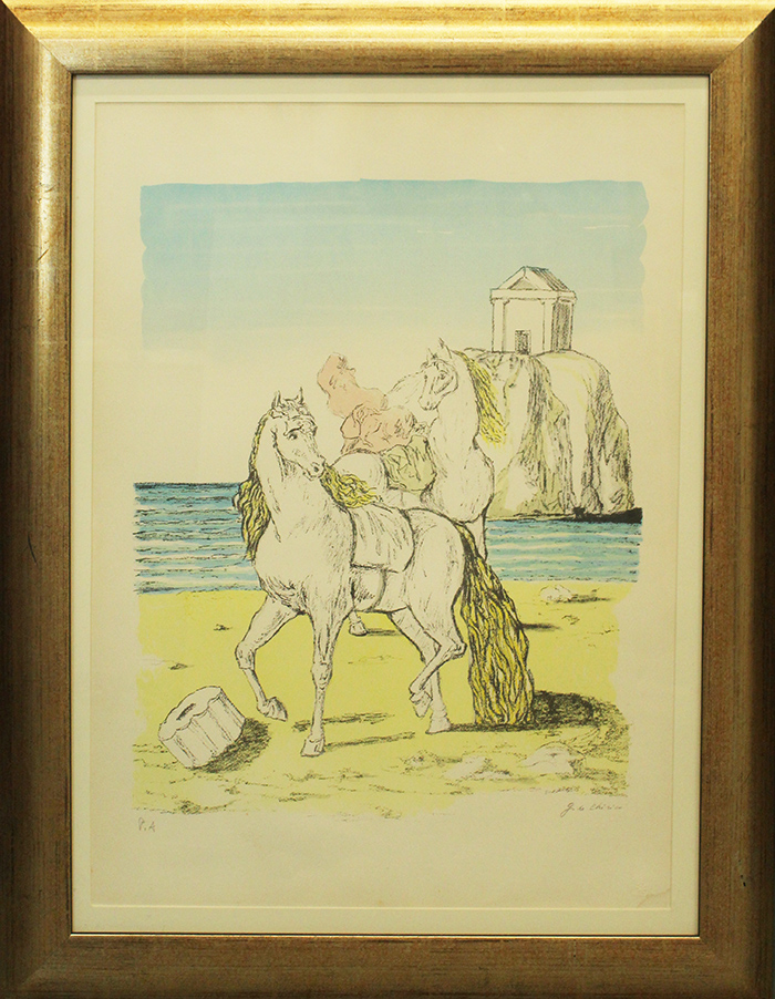 GIORGIO DE CHIRICO, "Cavalli con tempio", 1974, litografia a 9 colori esemplare P.A., cm 76x56, con cornice cm 93x73x2, peso 5 kg. Opera pubblicata a pag 220 di "Giorgio de Chirico - Catalogo dell'opera grafica". Opera accompagnata da certificato di autenticità di Arte investimenti