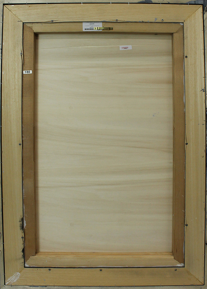 LUCA ALINARI, "Paesaggio onirico", anni 2000, olio e tecnica mista su tela applicata su tavola, cm 80,5x50x4, cm con cornice 93x62,5x5, peso 4 kg. Al fronte: in alto a sinistra. Al verso: etichetta in alto con informazioni. Opera con cornice.