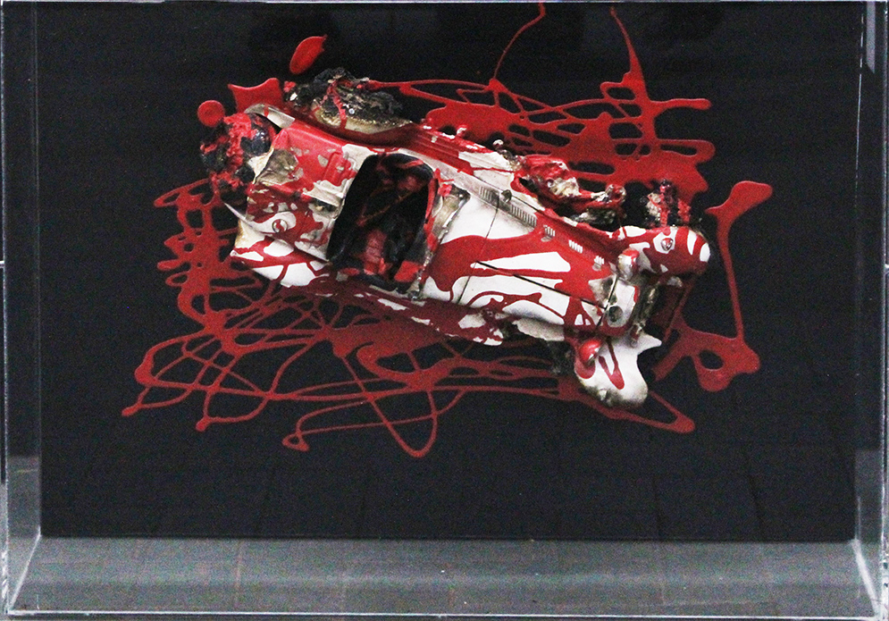 BERNARD AUBERTIN, "Auto bruciata", 2010, scultura tecnica mista su tavola, dim 30x40. Al verso: al centro firma e anno, in basso al centro targhetta con dimensioni