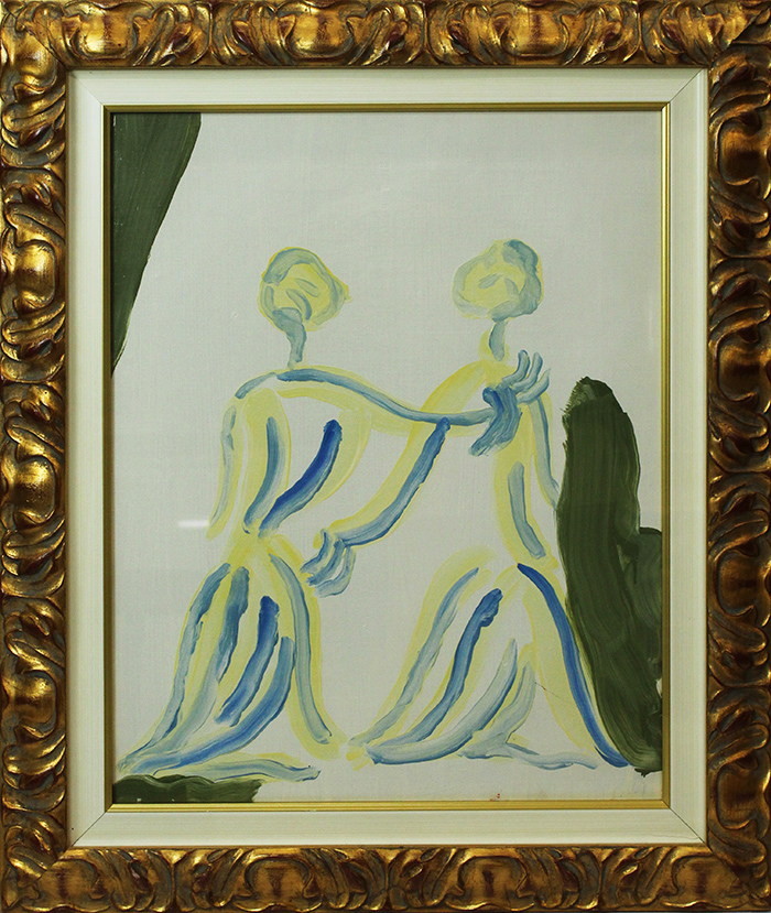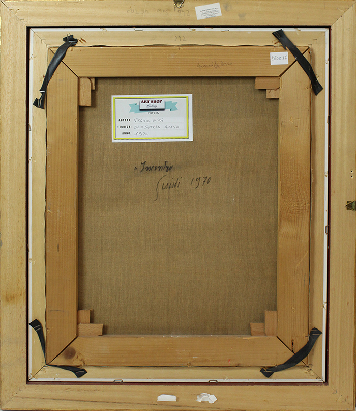 VIGILIO GUIDI, "Incontro", 1970, olio su tela, 50x40 cm, 66x56x4 cm, 3,50 kg. Opera archiviata dall'Archivio Storico Artisti Veneti in data 08/07/2019. Al verso: titolo, firma, anno, etichetta. Opera con cornice.