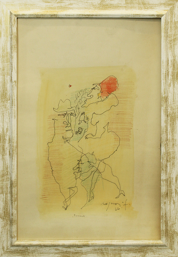 FRANCO ROGNONI, "Passanti", anni '70, tecnica mista su cartoncino, cm 50x32, con cornice cm 57x40x3, peso 1,20 kg. Al fronte: in basso al centro titolo, a destra firma e anno. Al verso: composizione di un violinista