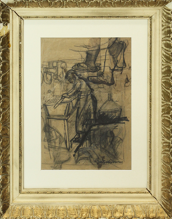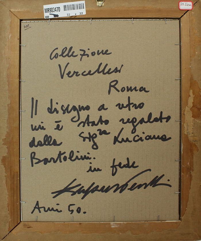 LUIGI BARTOLINI, "Composizione", anni '50, tecnica mista su carta, cm. 32x22, cm 50x39x4,5, peso 1,80 kg. Certificato di provenienza Galleria d'Arte La Sfinge, Roma. Al fronte: firma in basso a destra. Al verso: Collezione Vercelli Roma, il disegno mi è stato regalato dalla Signora Luciana Bartolini, anni 50. Opera con cornice.