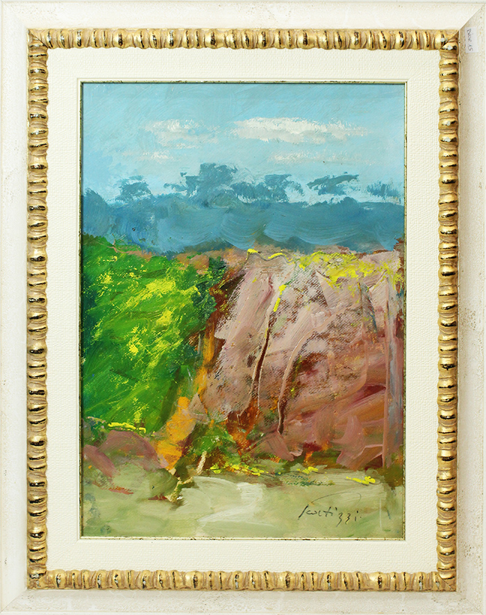 SERGIO SCATIZZI, "Paesaggio", 1984-5, olio su cartoncino riportato su cartone, 49,5x34,5 cm, con cornice 66x52,5x4 cm, peso 1,65 kg. Opera con certificato di provenienza Studio D'Arte Il Fiore, in data 27 settembre 2016 a cura di Alberto Diolaiuti. Opera con cornice.