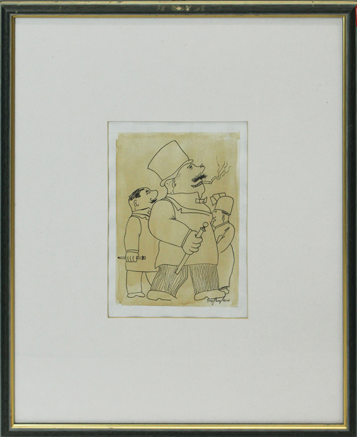 FRANZ BORGHESE, "Borghesi", anni 80, tecnica mista su cartoncino, 25x18 cm, cm con cornice 53x43x2, peso 1,65 kg. Al fronte: firma in basso a destra. Opera con cornice.