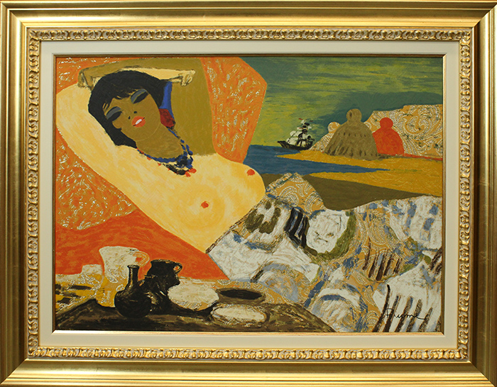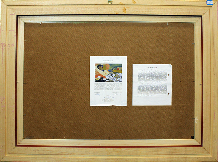 SALVATORE FIUME, anni '80, serigrafia polimaterica a 39 colori su broccato XIII/XXV, cm 50x70, con cornice cm 71x91x4,5, peso 4,60 kg . Al fronte: tiratura in basso a sinistra e firma in basso a destra. Al verso: certificato di autenticita della Fondazione Salvatore Fiume.