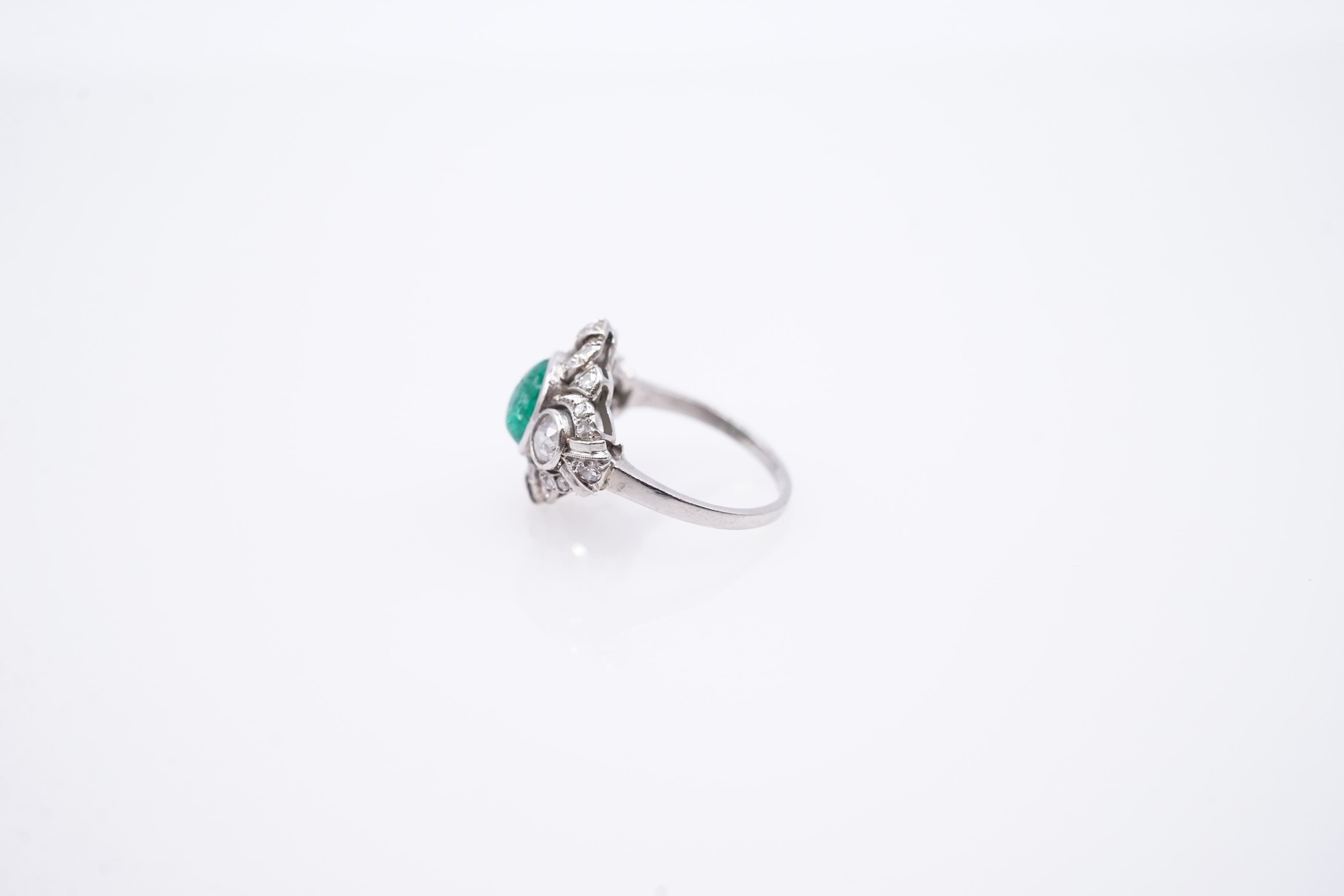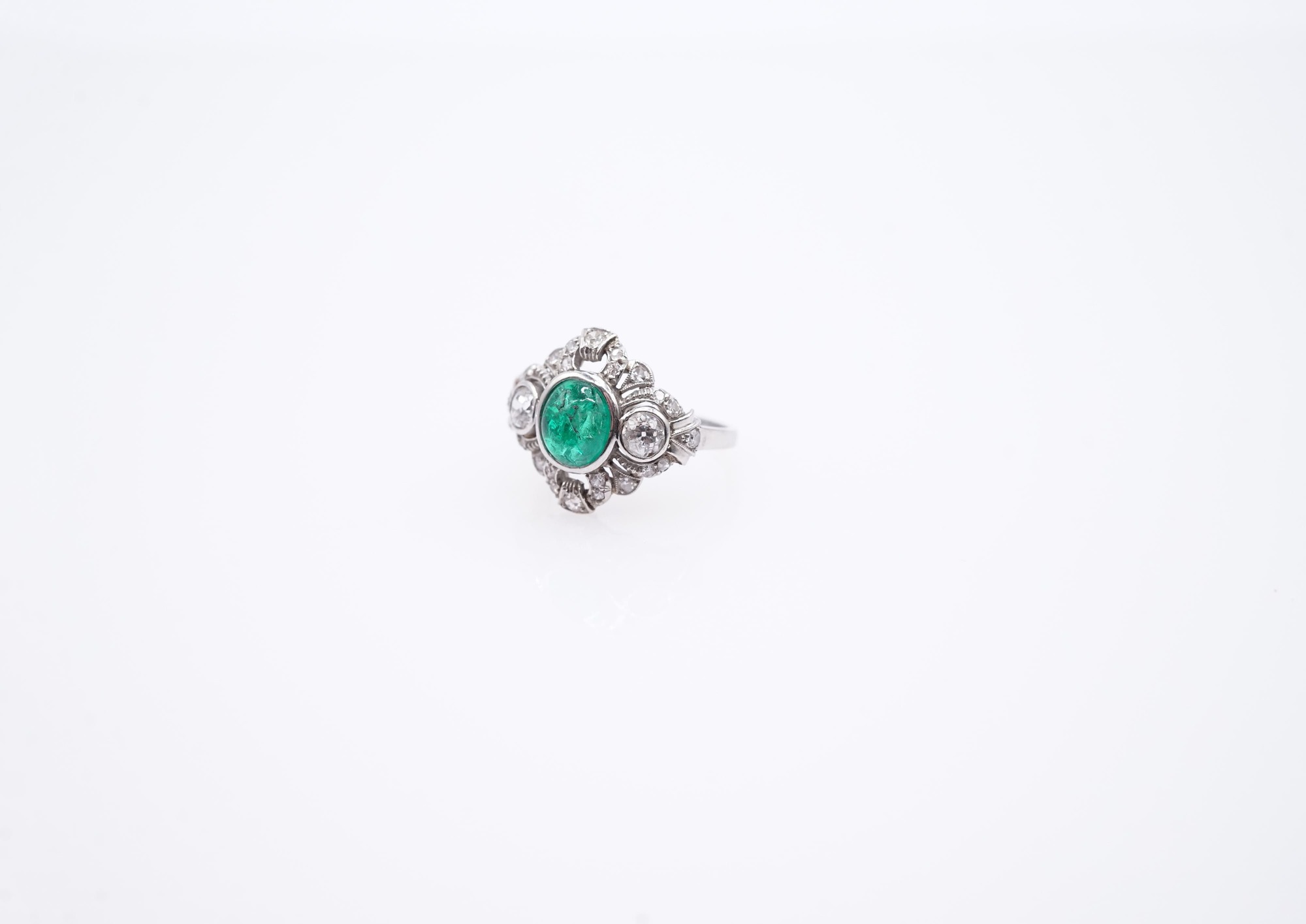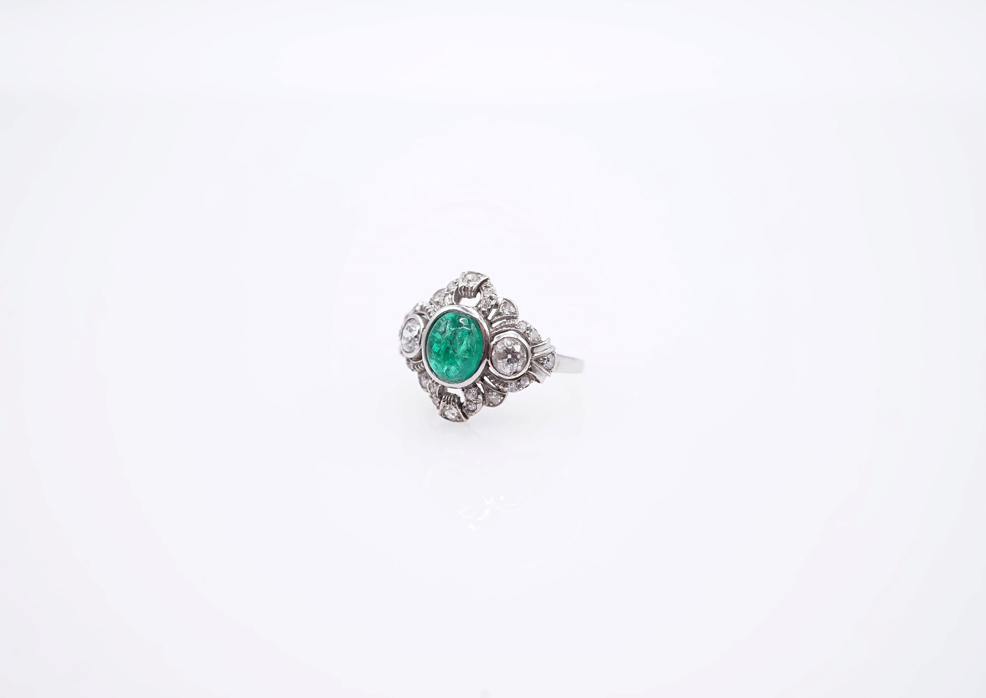 composto da un sottile gambo che salendo forma un elegante motivo bombato e traforato, incastonato con centrale smeraldo taglio cabochon affiancato da coppia di diamanti taglio old mine e contornato da piccoli diamanti taglio huit-huit. Lo smeraldo centrale di forma ovale, taglio cabochon , di circa 0.70 ct. Diamanti taglio brillante e taglio huit-huit per circa 1.25 ct totali. Misura anello 11. Peso 4.8 gr.