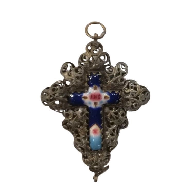 Ciondolo a forma di croce in filigrana d'argento e smalti. Probabilmente Francia, XIX secolo.
