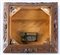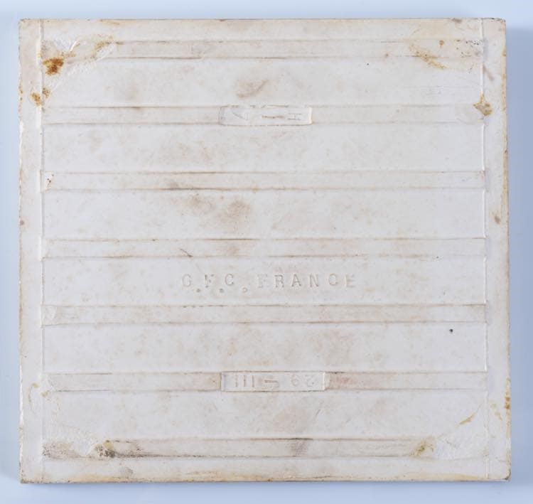 Cm. 7x30x30.In legno intagliato a motivi floreali. Decorato dall'inserimento di una mattonella in maiolica raffigurante cigno e iris gialli.