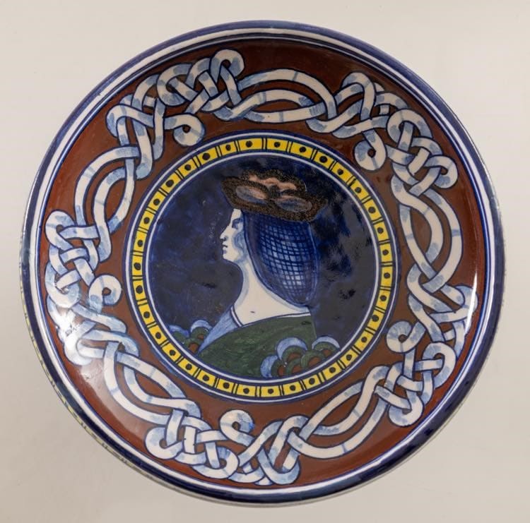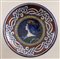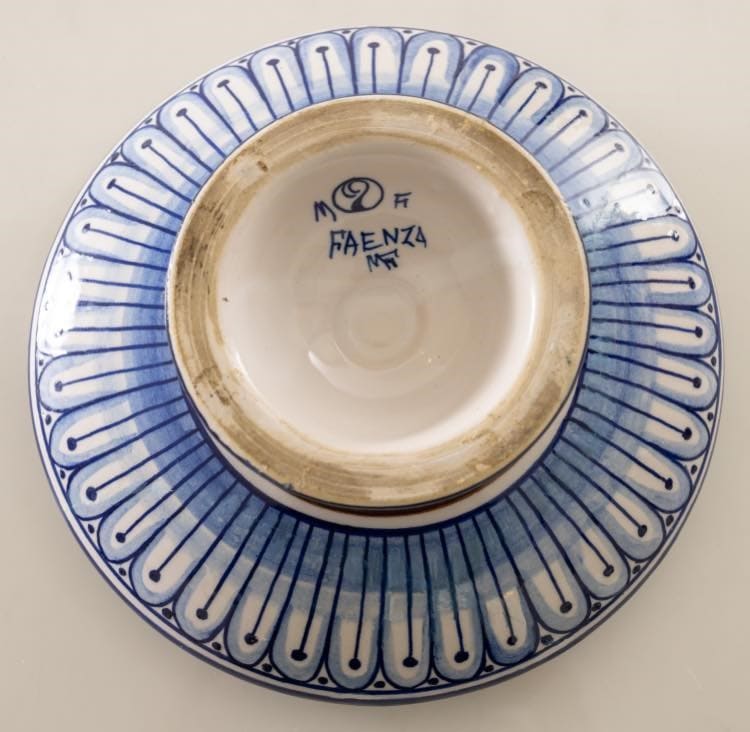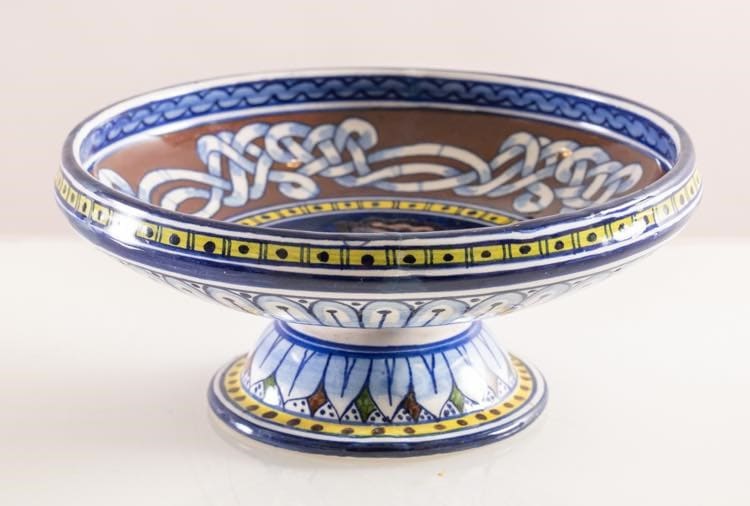 Alzatina in ceramica policroma smaltata con decorazione di dama e motivi geometrici.Cm 7xØ16.Opera firmata al retro MF, Faenza, MF.
