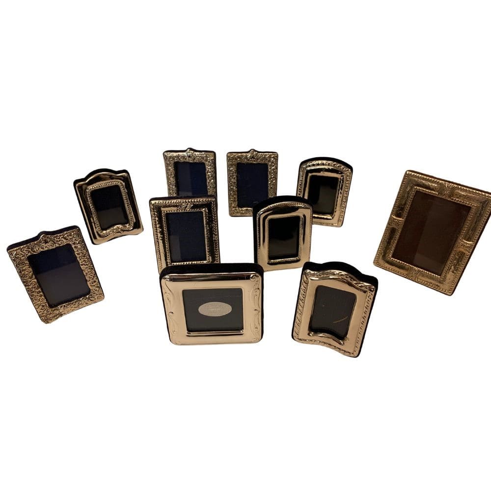 Lotto di 10 piccole cornici portafografie rivestite in lamina di argento. XX secolo.