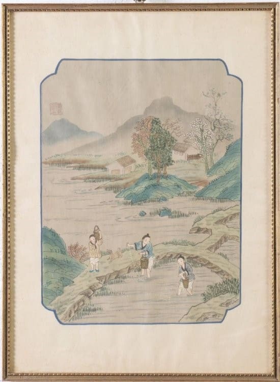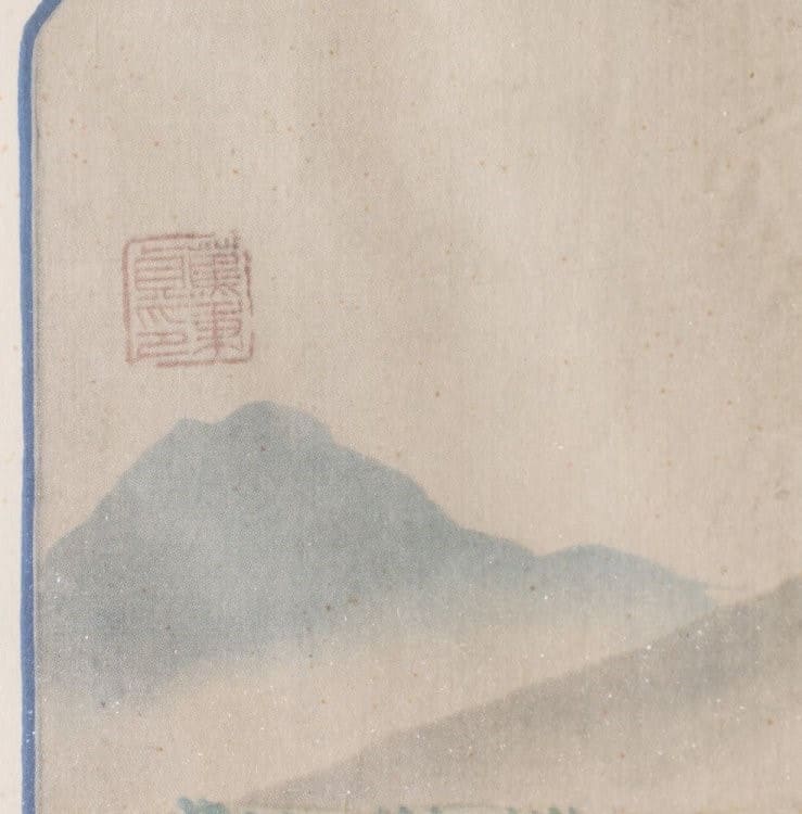 Stampa su carta raffigurante paesaggio con personaggi, Cina, XX secolo.