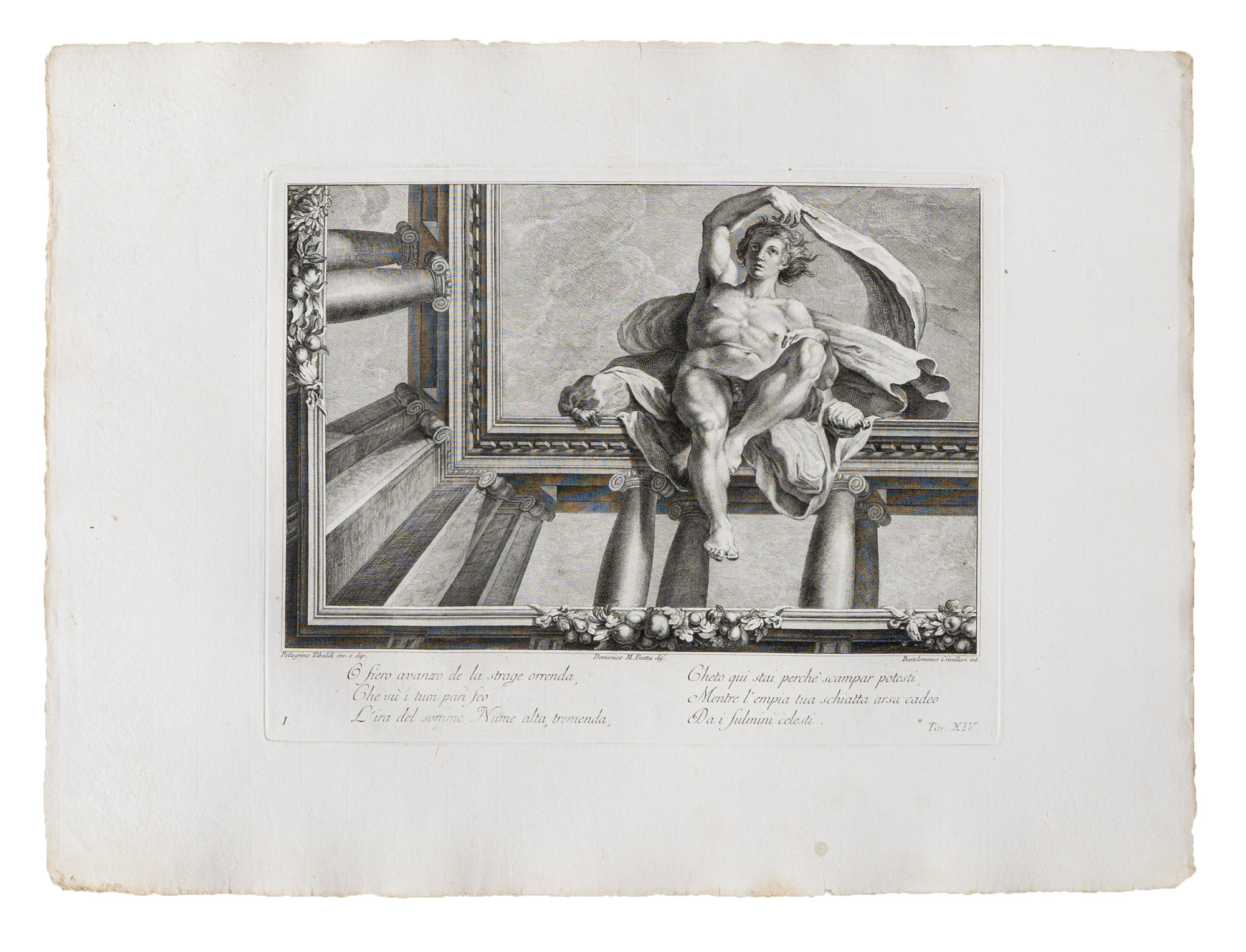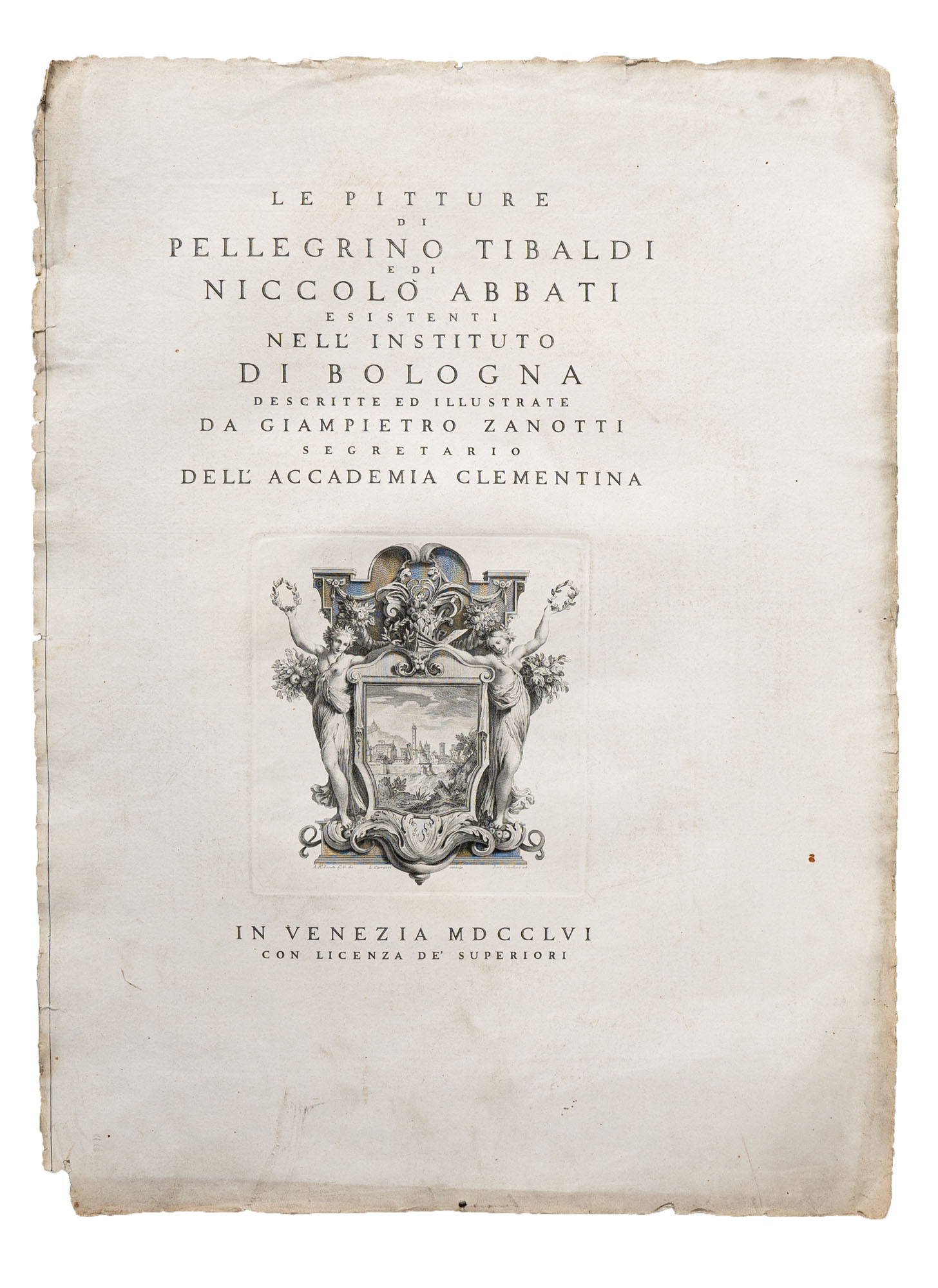 Giampietro Zanotti (Parigi, 1674 - Bologna 1765) - 'Le pitture di Pellegrino Tibaldi e Niccolò Abbati esistenti nell'istituto di Bologna descritte ed illustrate da Giampietro Zanotti segretario dell'Accademia Clementina'Al colophon: in Venezia MDCCLVI44 x 58,5 cm29 pagine e 41 tavole