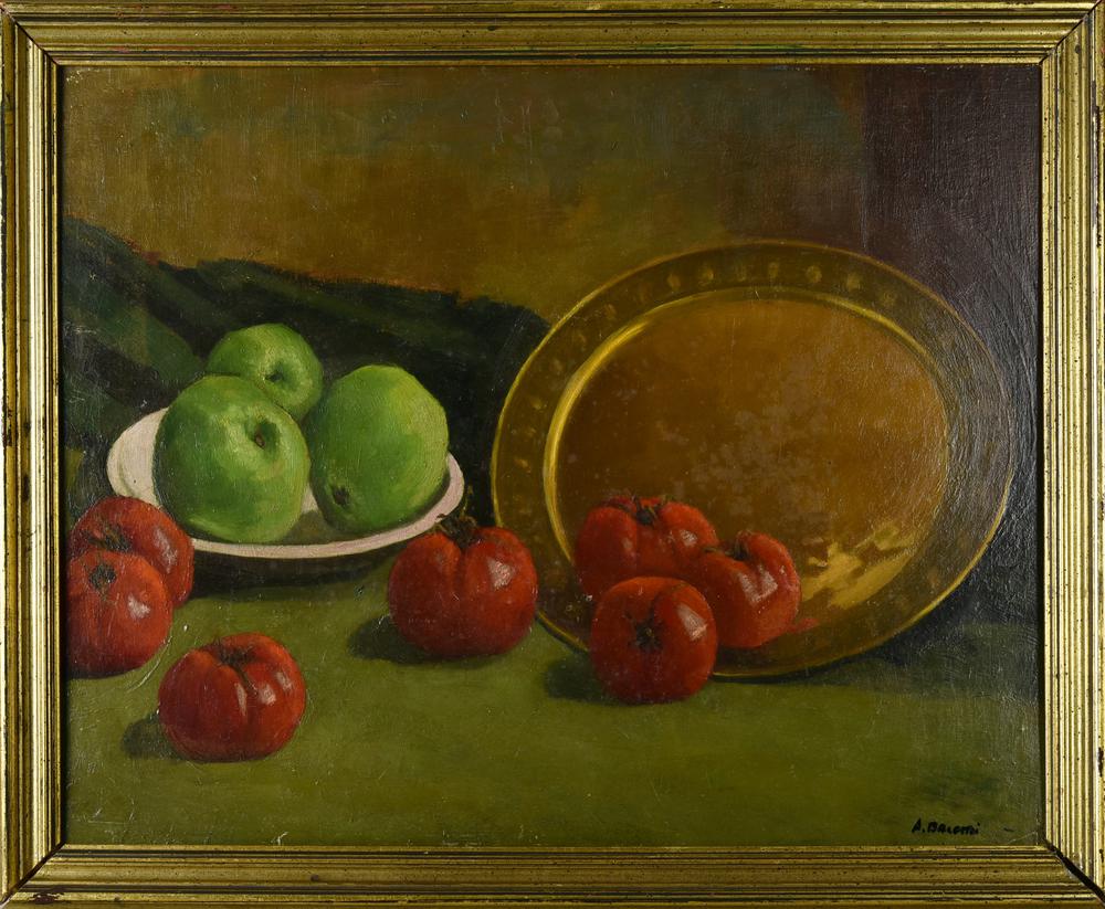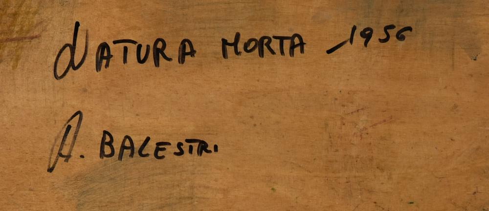 A. Balestri NATURA MORTA, 1956 olio su tavola, cm 40x50 firma sul retro:...