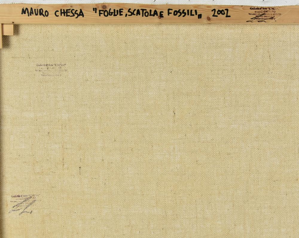Mauro Chessa FOGLIE, SCATOLA E FOSSILI, 2002 olio su tela, cm 60x80 firma e...