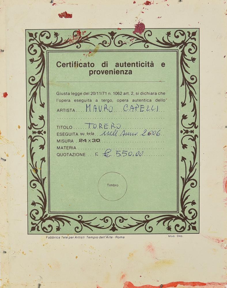 Mauro Capelli TORERO, 2006 olio su cartone telato, cm 24x30 firma sul retro:...