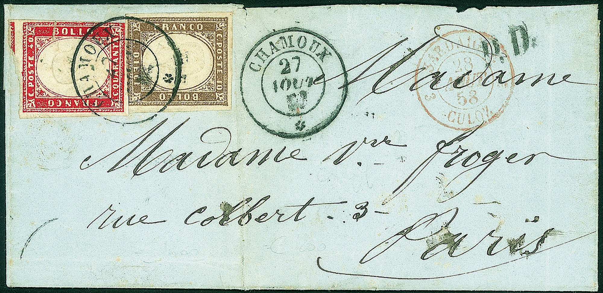 Antichi Stati Italiani - Sardegna - Annulli Savoia - 10 cent + 40 cent (14a + 16A)Letterina affrancata con 10 cent + 40 cent (14a + 16A) da Chamoux 27 AOUT.57 per Parigi - due note con questa combinazione - cert. Roumet