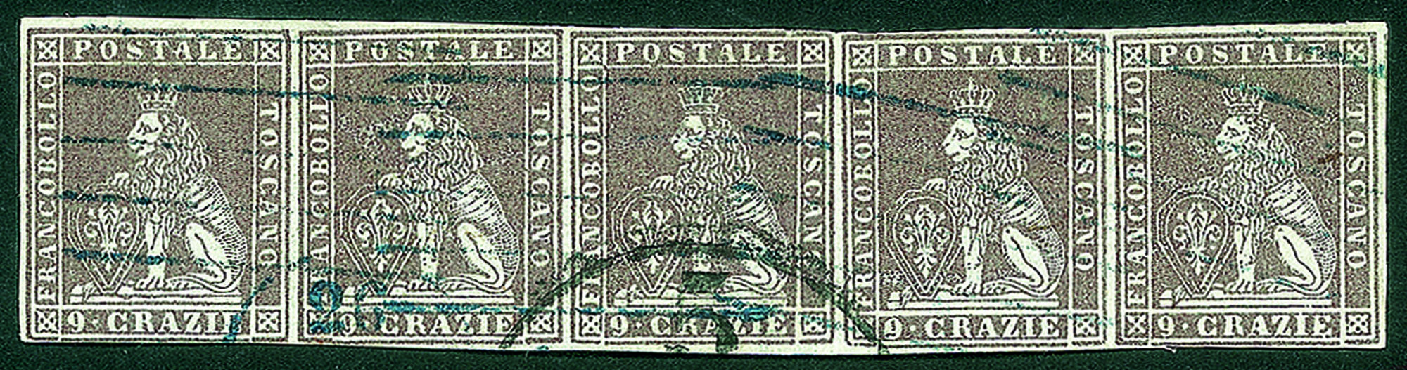 Antichi Stati Italiani - Toscana - 1851 - Striscia orizzontale di cinque del 9 crazie (8 cat.15000)Striscia orizzontale di cinque del 9 crazie viola bruno su grigio (8 cat.15000) - usata con buoni margini - cert. Raybaudi + Enzo Diena