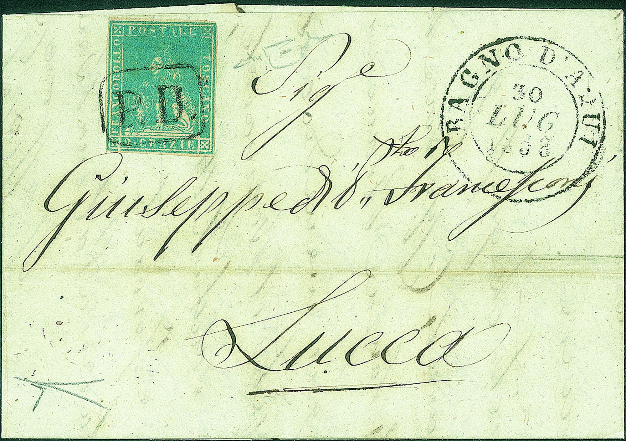 Antichi Stati Italiani - Toscana - Bagno d'Aqui (doppio cerchio) + PD in cartella (P.ti 13) - 2 crazie (13) su lettera per Lucca del 30.7.58Raybaudi + cert. Bottacchi