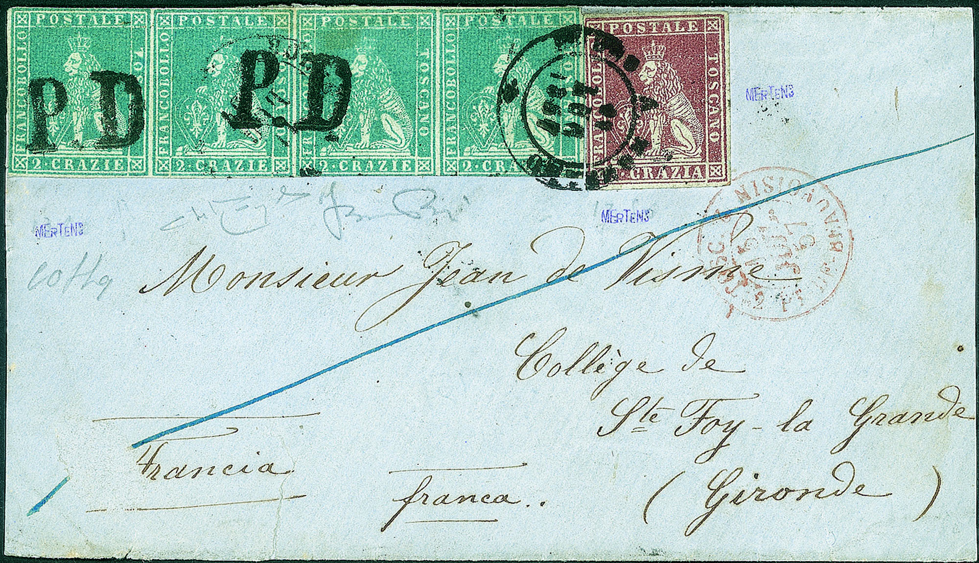 Antichi Stati Italiani - Toscana - Borgo a Mozzano (doppio cerchio) + PD grande annullatore (P.ti R2) - striscia di quattro del 2 crazie + un 1 crazia (4e + 5)Su lettera per S. Foy La Grande (Francia) del 11.7.57