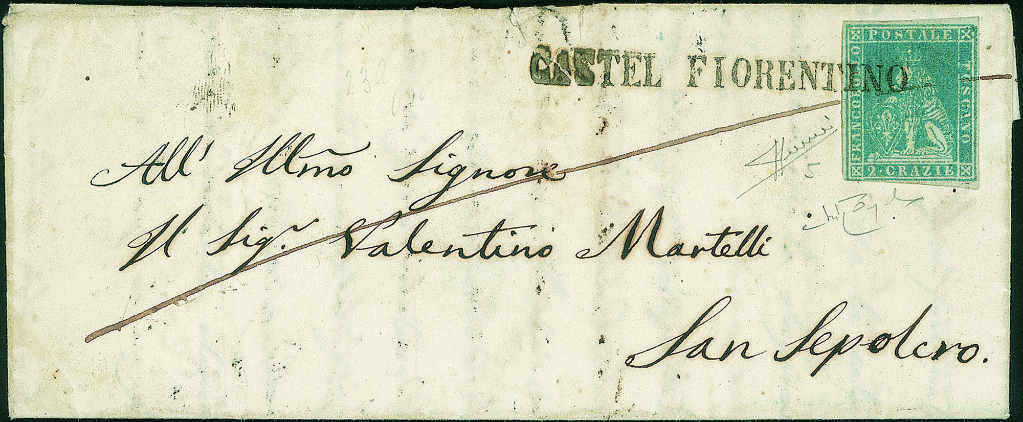 Antichi Stati Italiani - Toscana - Castel Fiorentino (stampatello lineare P.ti R1) - 2 crazie (5)Su lettera per S. Sepolcro del 23.8.55 - fresca e molto bella - cert. Raybaudi + Sorani