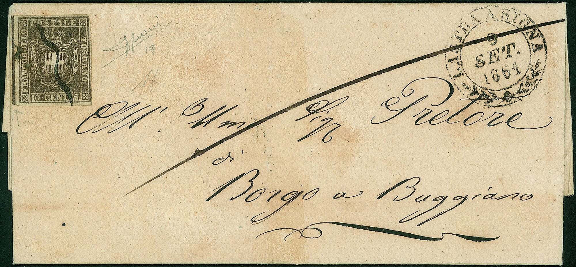Antichi Stati Italiani - Toscana - Lastra a Signa (doppio cerchio) + annullo con tratto a penna (P.ti R2) - 10 cent (19g)Con linea di riquadro verticale a sinistra - lettera per Borgo a Buggiano del 9.9.61 - probabile frode postale in quanto il 10 cent presenta traccia di precedente annullo - molto bella - Diena + cert. Sorani