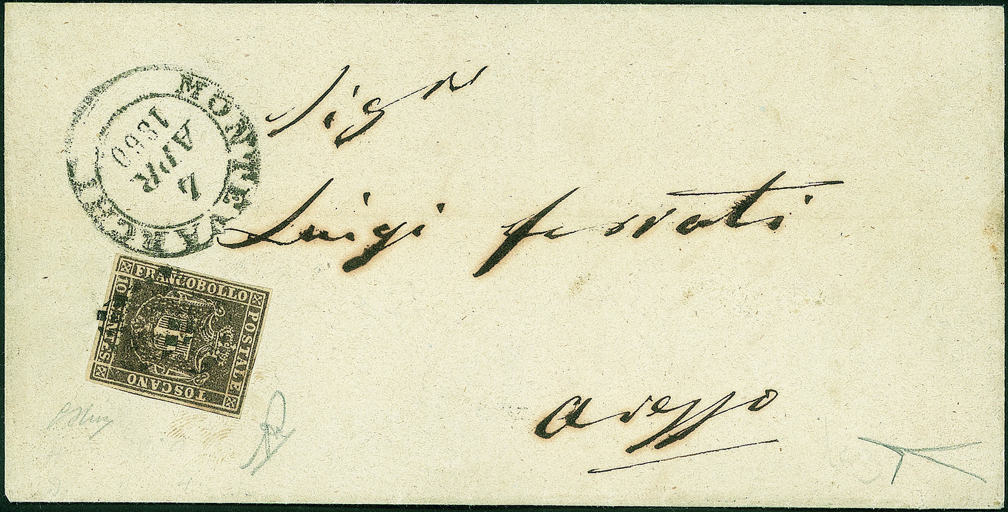 Antichi Stati Italiani - Toscana - Governo Provvisorio - Montevarchi (muto a rombi P.ti R1) su 10 cent bruno (19)Su lettera per Arezzo del 4.4.60 - Oliva + cert. Bottacchi