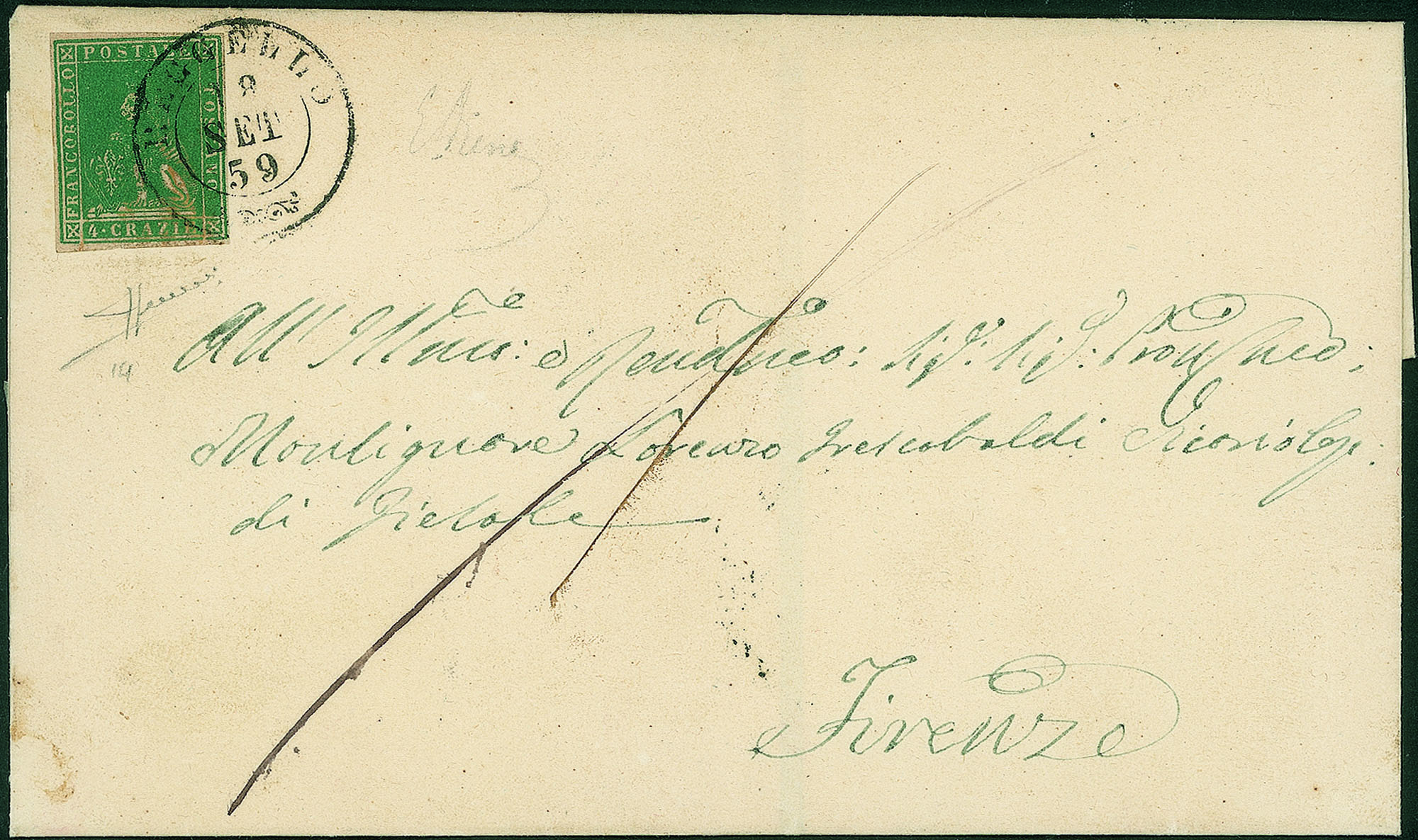 Antichi Stati Italiani - Toscana - Governo Provvisorio - Reggello (doppio cerchio P.ti R3) su 4 crazie (14)Su lettera per Firenze del 18.9.59 - molto bella - Diena + cert. Sorani
