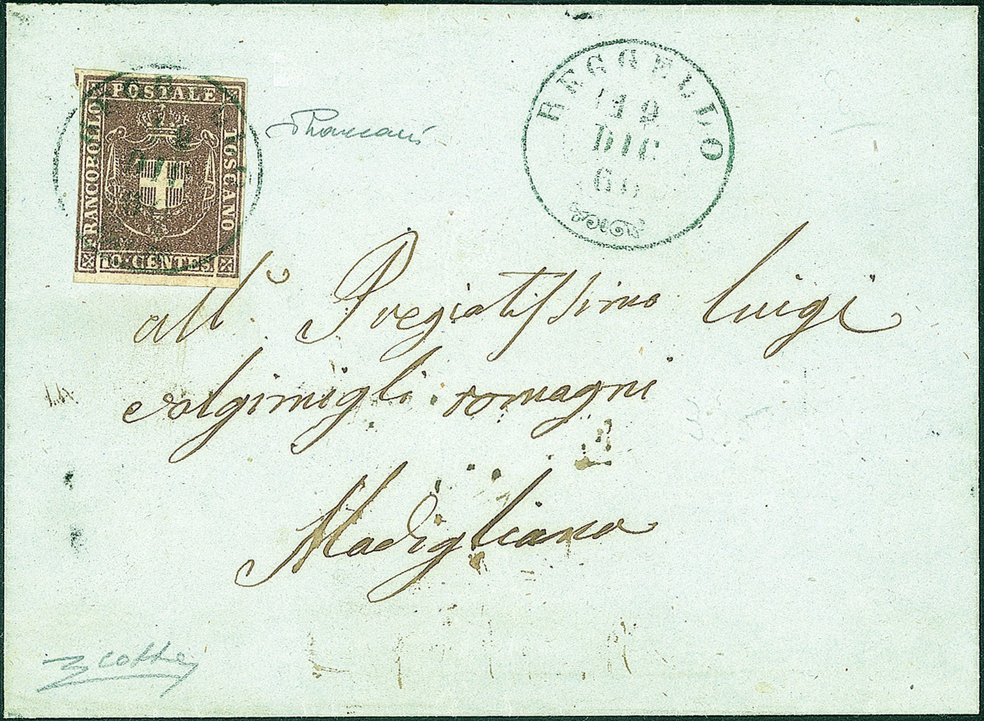 Antichi Stati Italiani - Toscana - Governo Provvisorio - Reggello (doppio cerchio medio azzurro P.ti R1) su 10 cent bruno (19)Ripetuto a lato su lettera per Modigliana del 19.12.60 - molto bella - Vaccari + cert. Colla