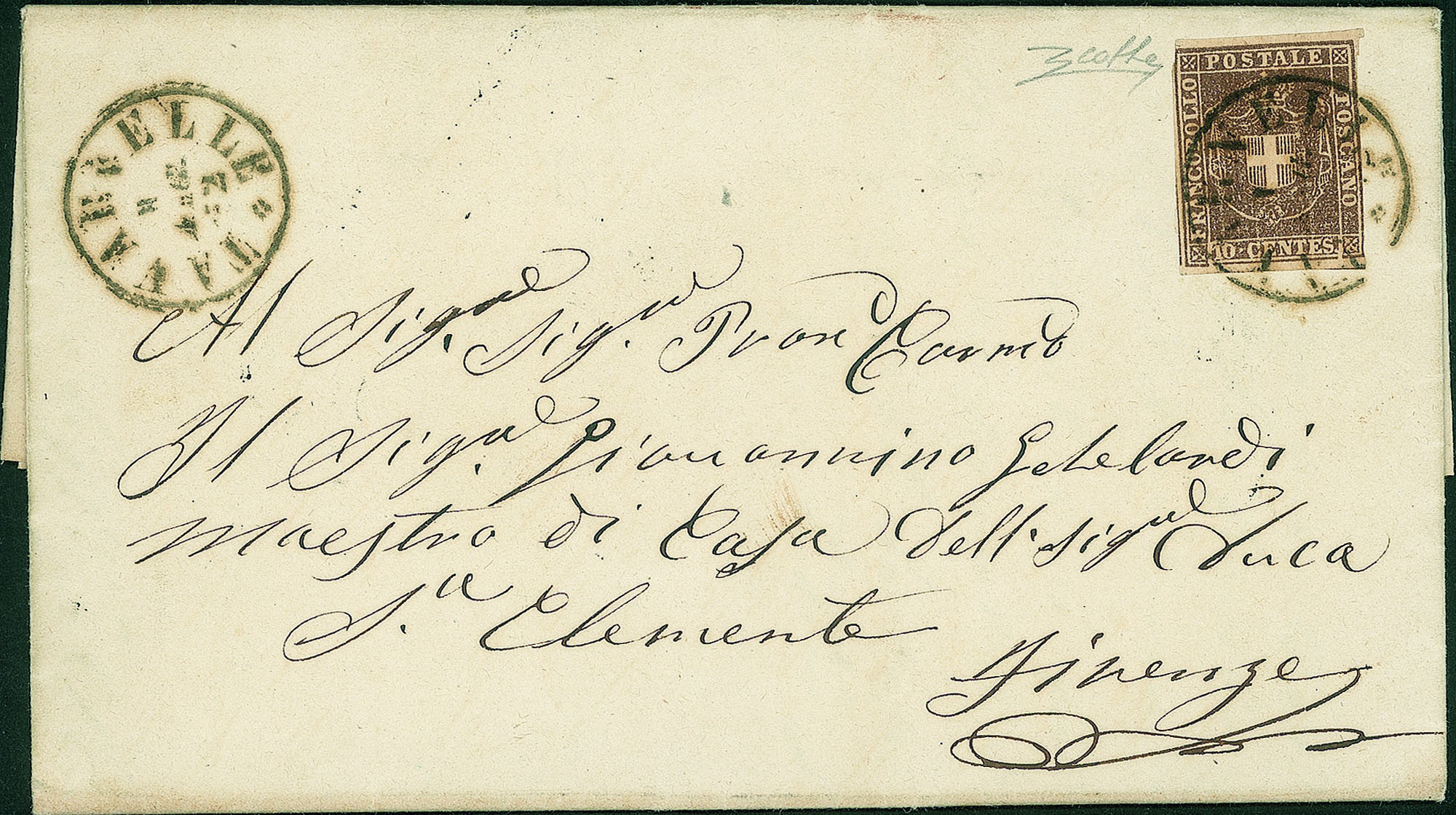 Antichi Stati Italiani - Toscana - Governo Provvisorio - Tavarnelle (cerchio semplice medio P.ti R3) su 10 cent (19)In uso tollerato a validità scaduta (31.12.61) - lettera per Firenze del 1.5.62 - raro annullo su questa emissione - cert. Colla
